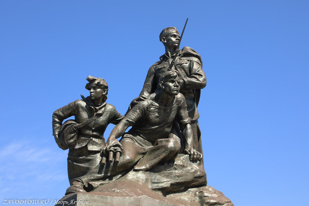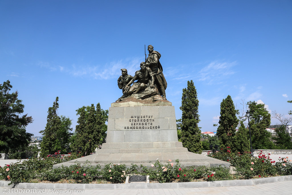 Памятник комсомольцам, построенный в 1963 году - один из самых искренних, проникновенных и динамичных монументов города. Скульптурная группа состоит из трех фигур: солдат, сжимающий винтовку, матрос со связкой противотанковых гранат, готовый к броску, и девушка-санитарка с медицинской сумкой через плечо. Замечательно переданы лица - этих разом повзрослевших мальчиков и девочек 1923 года рождения, из которых вернулось с войны всего три процента.