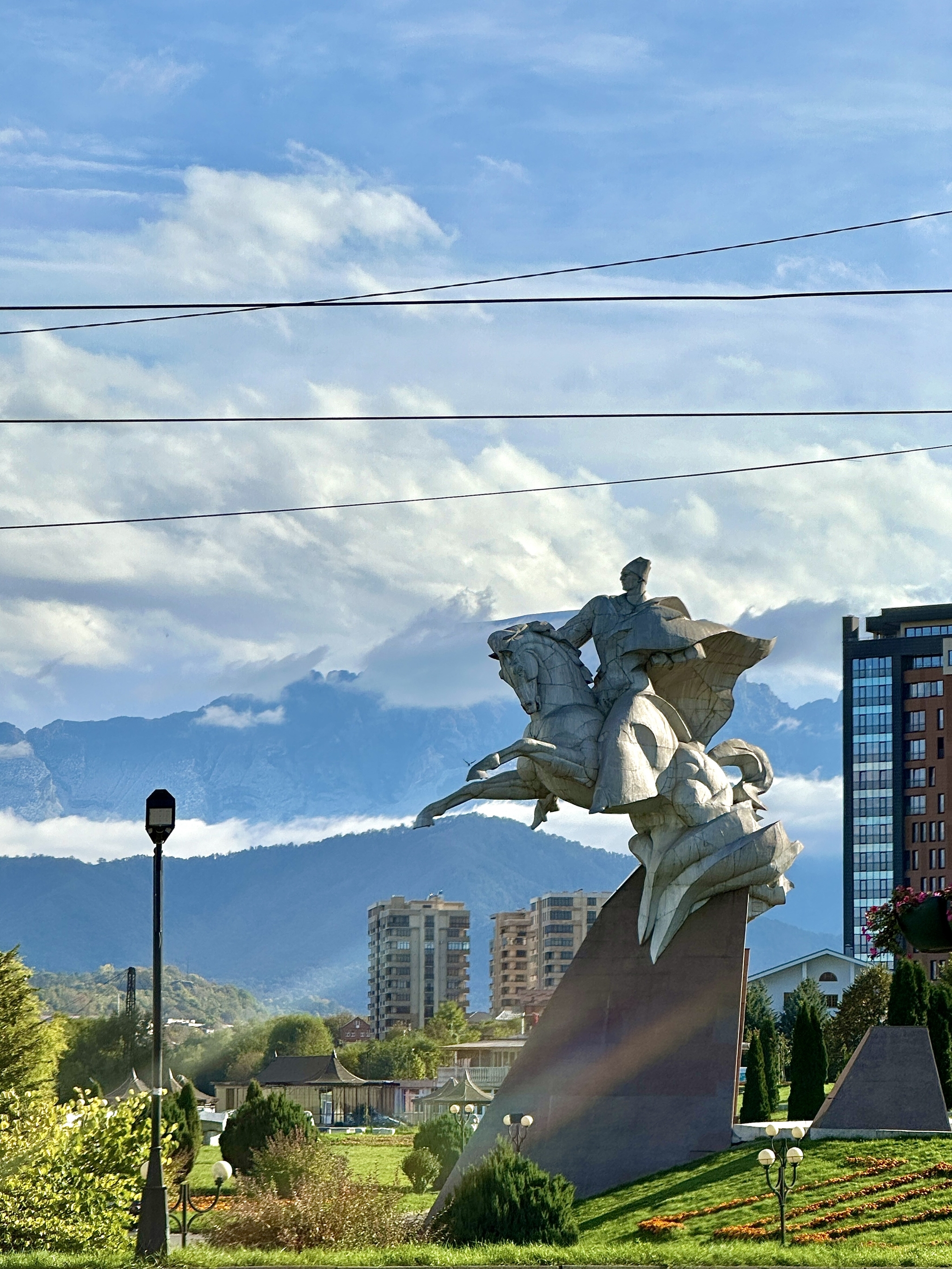 Памятник генералу армии, командиру кавалеристской дивизии, дважды Герою Советского Союза, уроженцу Терской области Иссе Плиеву установлен на площади его имени, выходящей на набережную Терека. Постамент из трёх гранитных трапеций очертанием напоминает горные вершины. Генерал изображён верхом на рвущемся вперёд коне. Суровый облик, левая рука, сжатая в кулак, развевающийся на ветру плащ – всё говорит о готовности в любой момент встать на защиту Отечества.