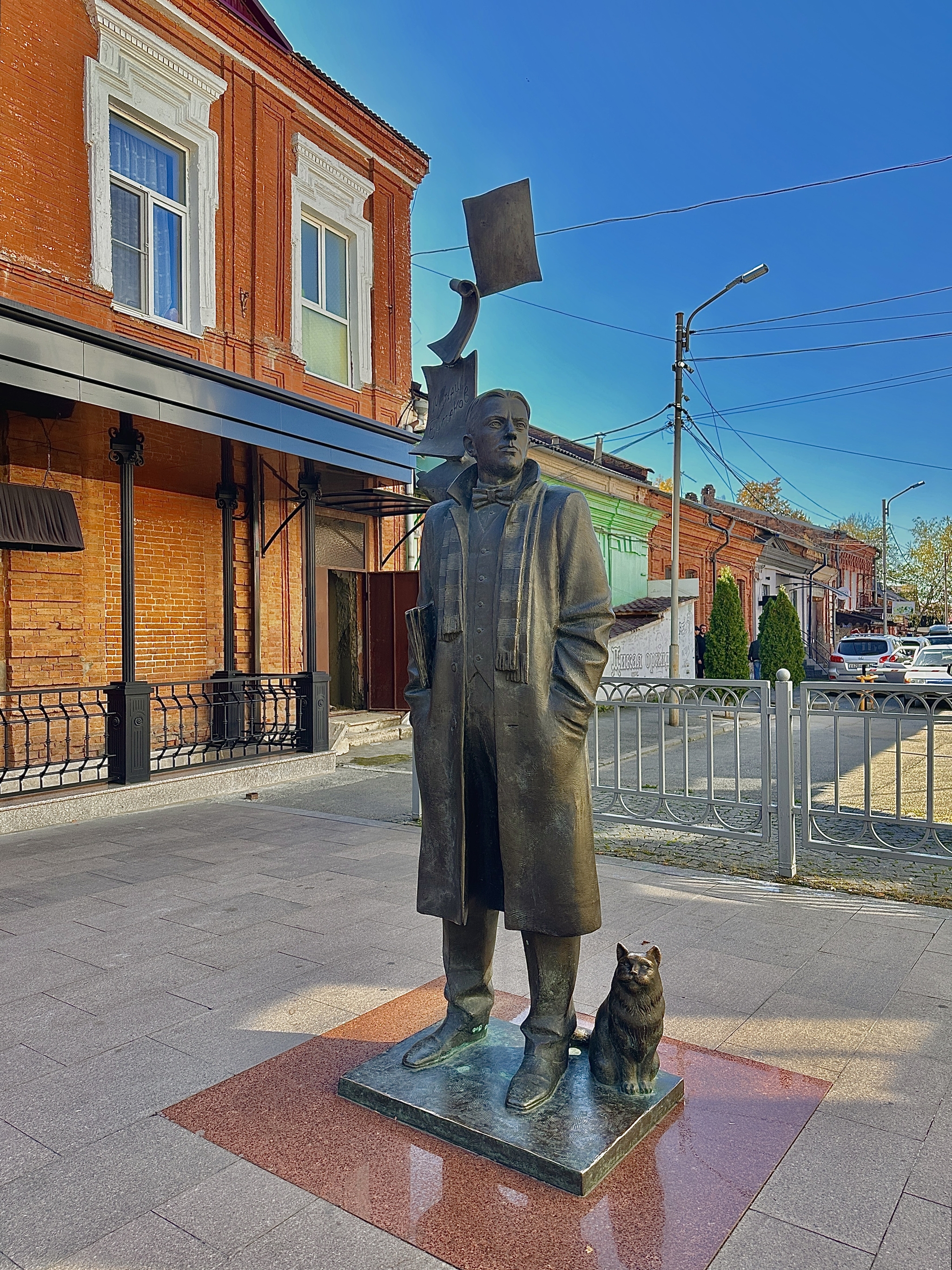 Скульптура Михаила Булгакова на углу пр-та Мира и ул. Маяковского напоминает о годах жизни, проведенных писателем во Владикавказе. У ног будущего автора «Мастера и Маргариты» сидит кот Бегемот, над головой взлетают исписанные листы бумаги