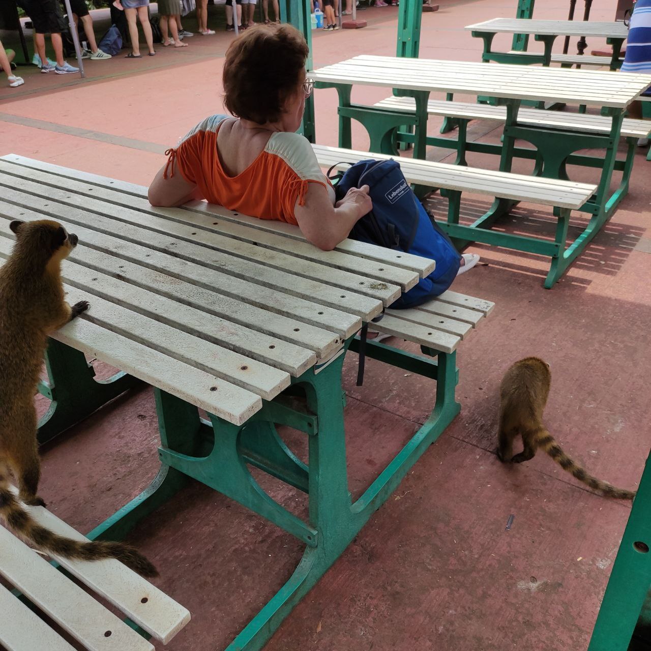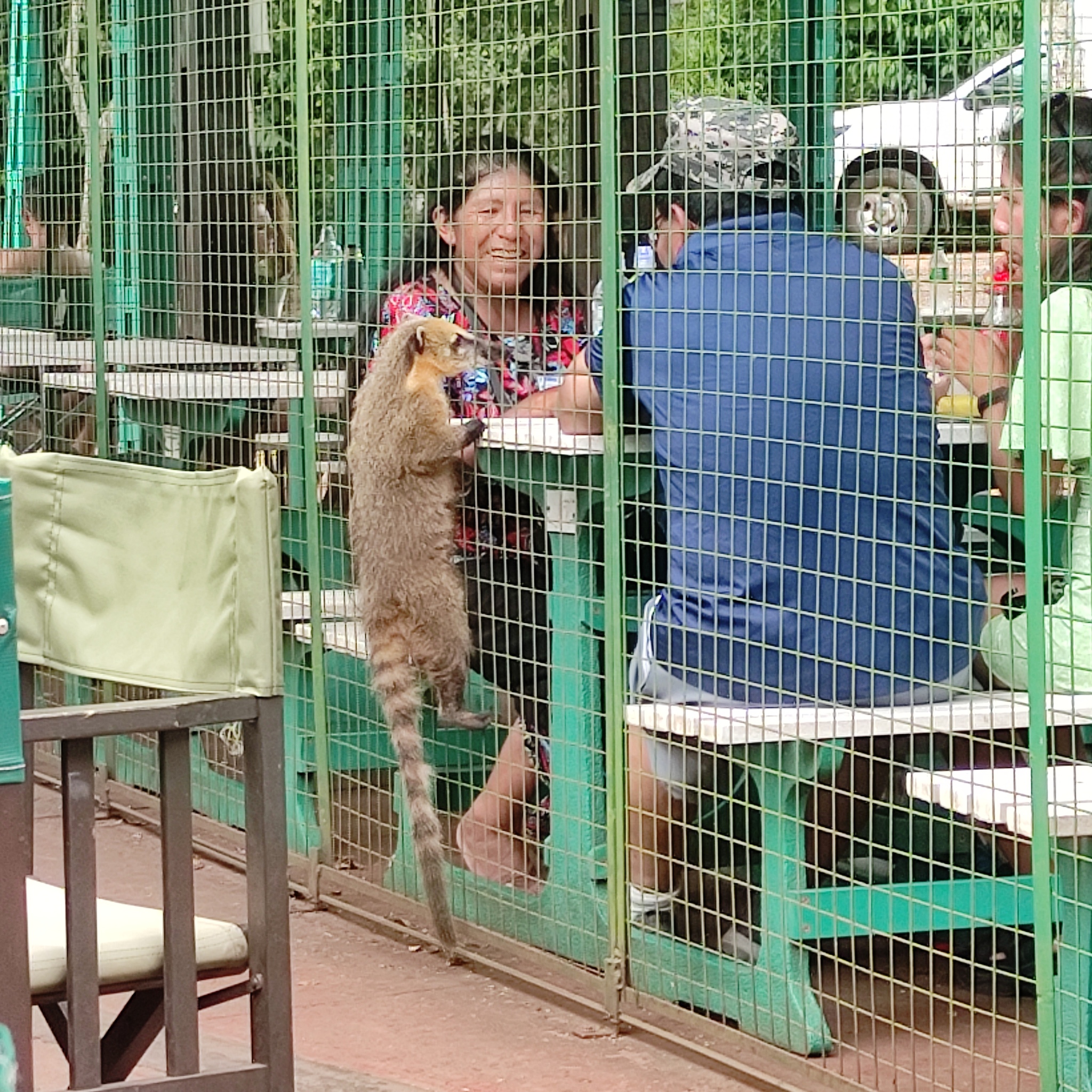 Я был свидетелем того, как паренёк по доброте душевной решил поделиться своим сэндвичем с носухой, которых тут называют "Коати". Знаете, чем все кончилось? Прибежало ещё две! Первая забралась на стол по спинке стула и начала отбирать всю еду, что там была. Парень в ужасе ретировался за железную решетку. Да, в этот момент стало ясно, для чего нужен огромный вольер - для людей, чтобы они могли спокойно поесть.