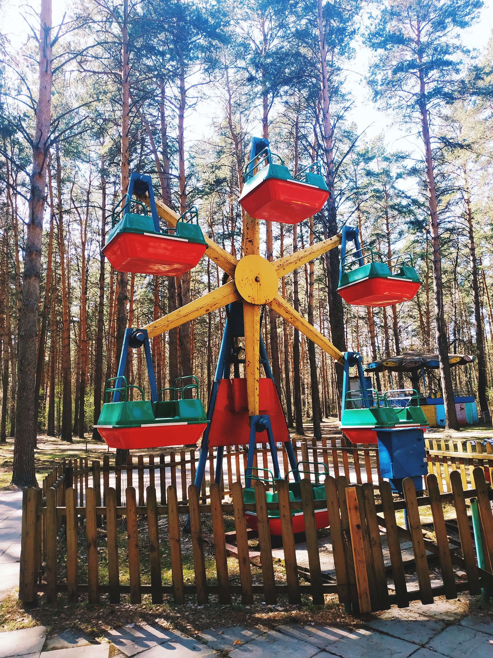 Карусели выглядят жутко: ржавые, облупленные, ещё советские. Не работают, стоят на задворках парка среди деревьев.