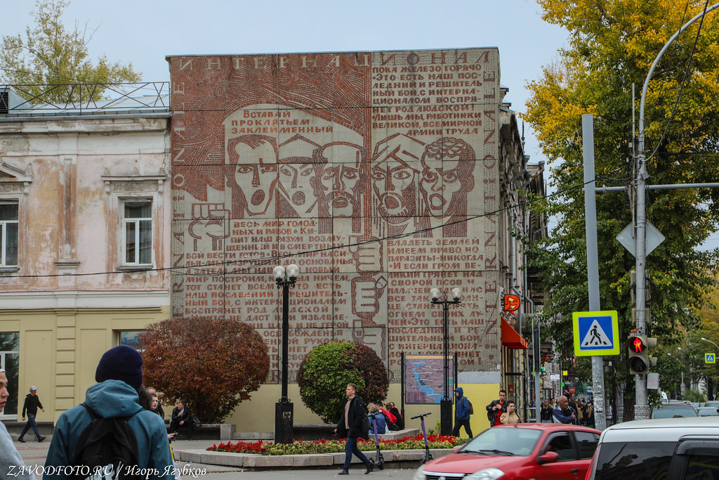 Масштабное панно «Интернационал» с полным текстом гимна, которое появилось на улице Пролетарская в 1967 году в год 50-летия Октябрьской революции. Автор проекта и руководитель группы художников - Анатолий Гетманский. Панно изготовлено из кусочков метлахской плитки.