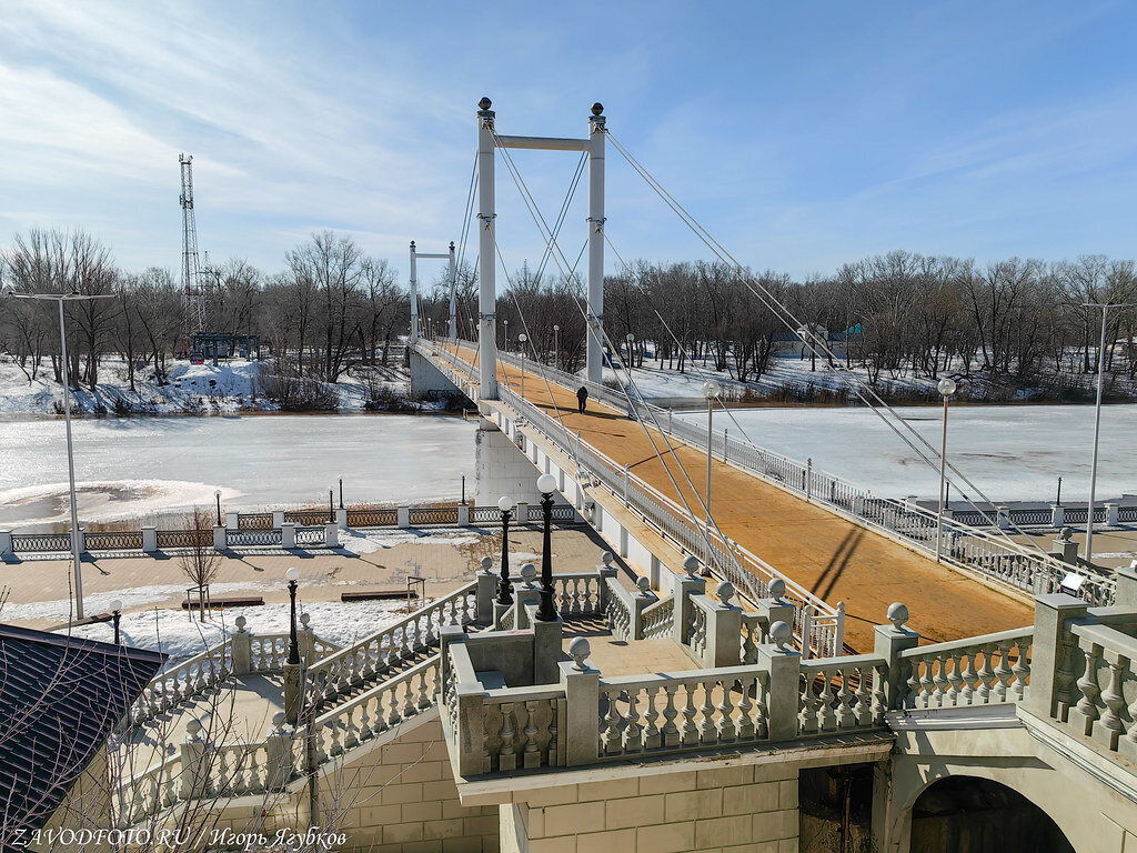 Белоснежный мост ведет из исторического центра Оренбурга в парк «Зауральная роща».