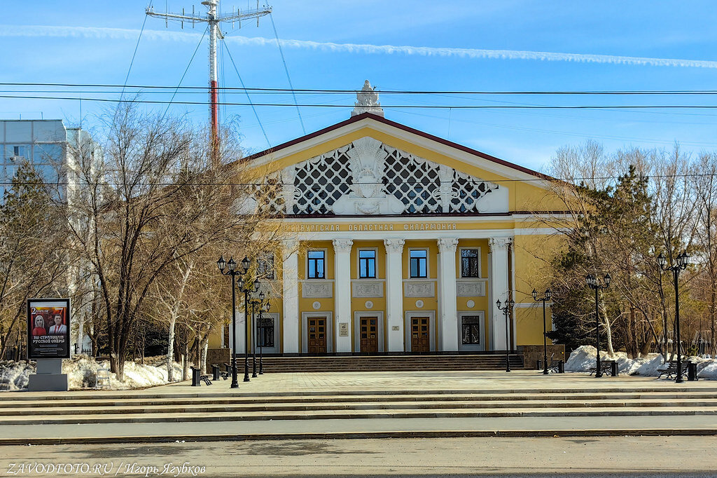 Оренбургская областная филармония. Здание, выполненное в стиле советского классицизма, радует глаз своим ажурным фронтоном с растительными элементами и колоннами коринфского ордера.