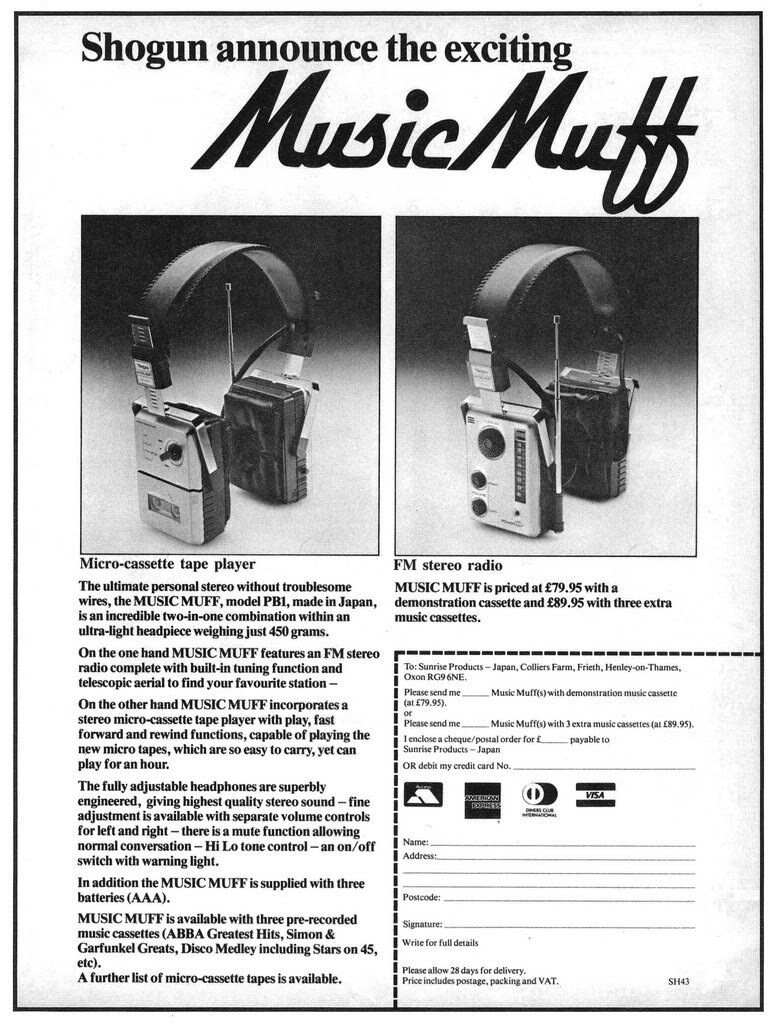 Магнитолу в наушниках, под маркой Shogun Music Muff, начали продавать в 1982 году.