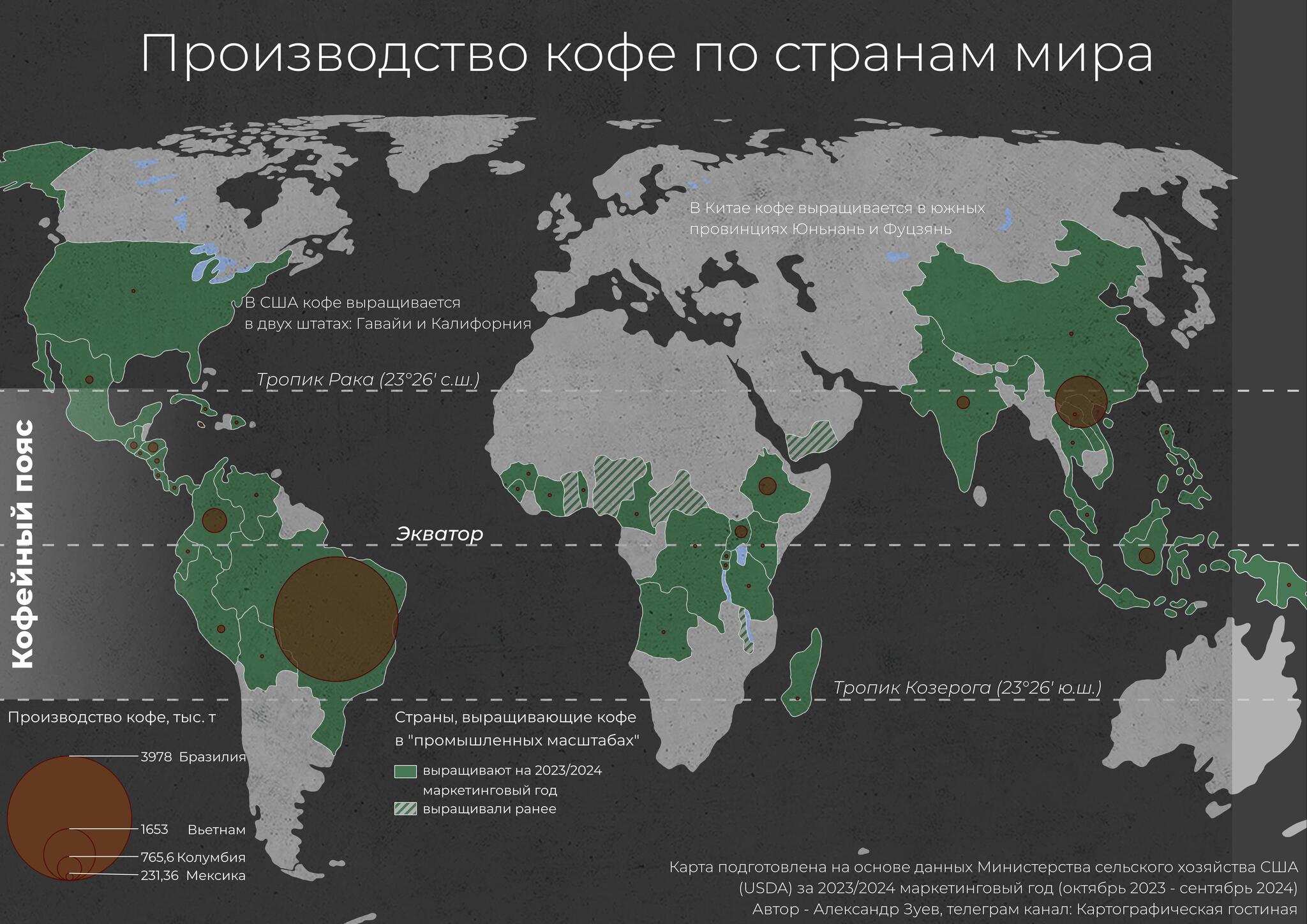 Карта производства кофе по странам мира - первая карта из трех, посвященных кофе, что я делаю. На ней представлены данные за 2023/2024 маркетинговый год - самые последние, что есть на данный момент, 2024/2025 маркетинговый год закончился в октябре, но статистики по нему пока нет.
