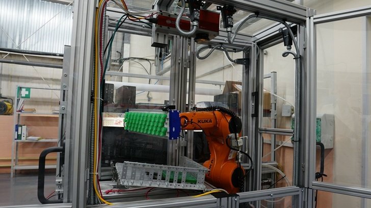 Помимо образовательного направления, в Макро Групп развивают и направление промышленной робототехники — решения на основе роботов для автоматизации различных процессов. За это направление отвечает компания «Макро Солюшнс», которая разработала интересное решение — это многофункциональная роботизированная установка, которая позволяет автоматизировать различные этапы, встраиваясь в производственную линию. Установка сделана мобильной, таким образом, её легко перемещать между участками, для выполнения различных задач. Например, установка может заниматься загрузкой или выгрузкой плат, нанесением покрытия на плату, или, скажем маркировкой платы с помощью лазера. Можно придумать ещё множество других задач для различных техпроцессов, не только в электронном производстве. Благодаря мобильности, эта установка довольно легко встраивается в любую уже работающую линию, или может работать как отдельное оборудование.