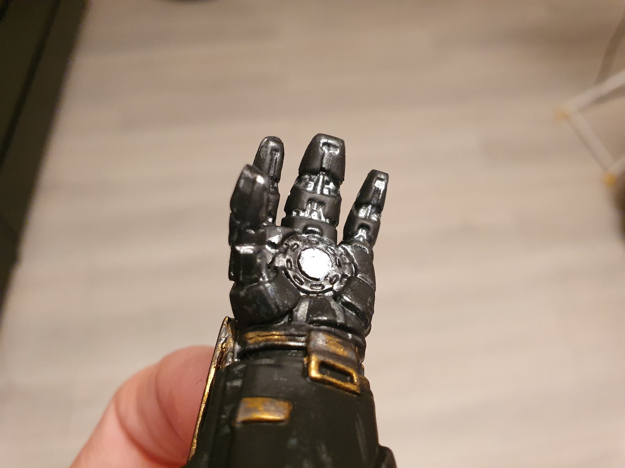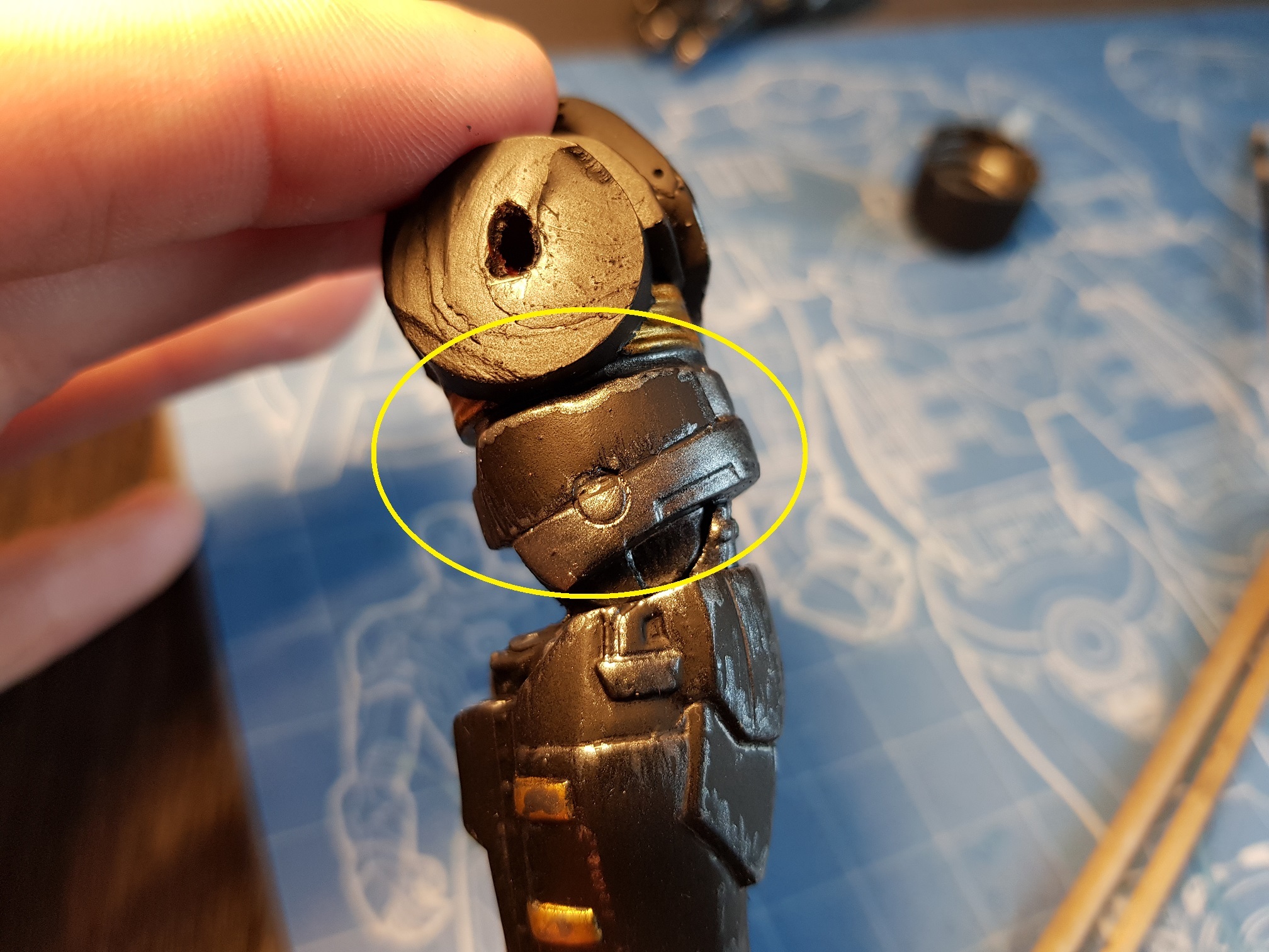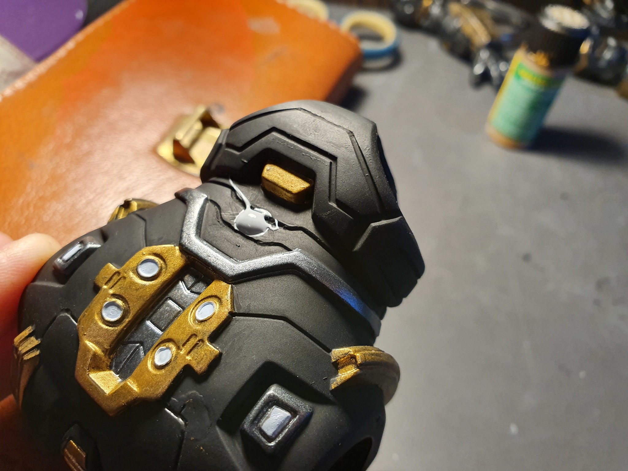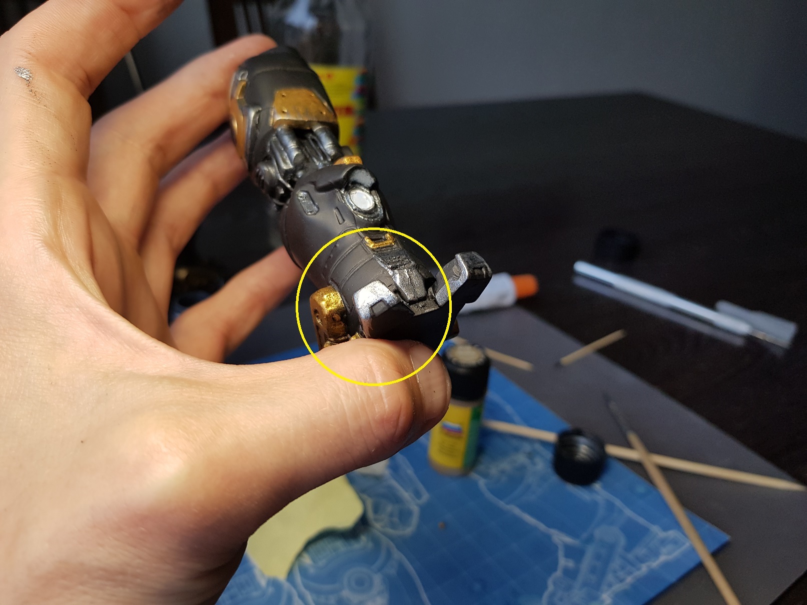 Вернулся к нанесению "Серебра", то есть "Стали". Помимо деталей, которые на Х изначальне не крашены и должны быть стального цвета. Легонько мазюкаю там, где Х мог обордраться во время жарких баталий. На пример локти.