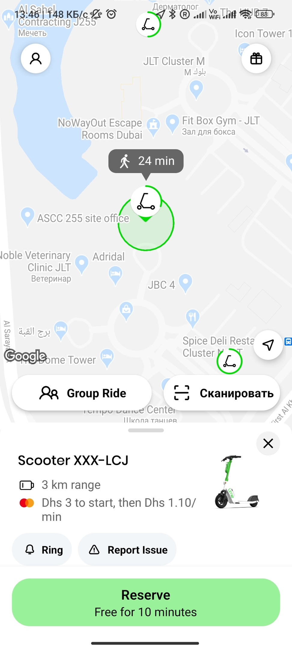 4. Подойдя к самокату, сканируете QR код на руле и он разблокируется. Стоимость поездки: 3 дирхама за разблокировку и 1,1 дирхама за каждую минуту поездки