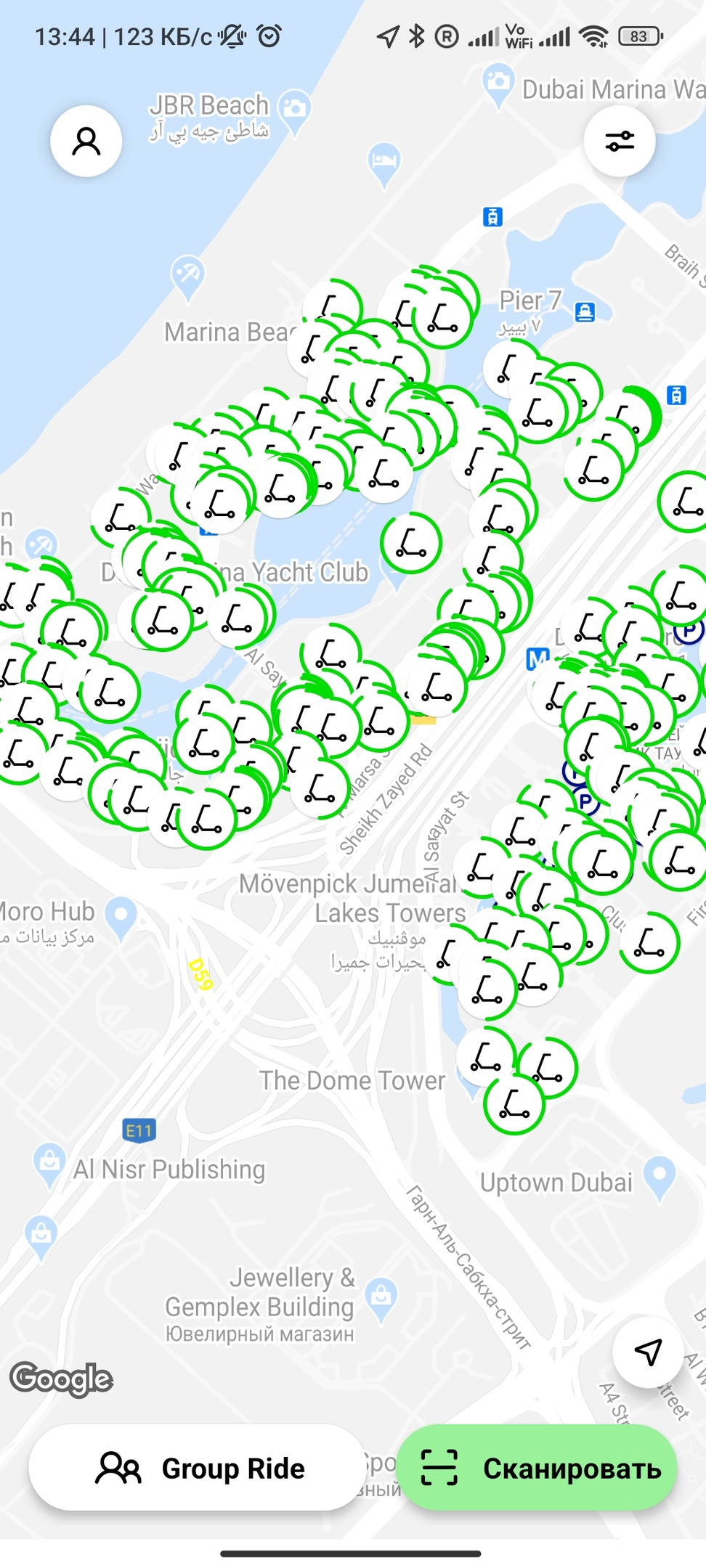 У других сервисов примерно такие же условия и цены, но чуть другая территория обслуживания и количество самокатов. У Tier, например, в территорию помимо Даунтауна, Дубай Марины и Джумейры также входит Бур Дубай и Дейра, но число свободных самокатов там исчезающе мало... Цена у Tier также 3 дирхама за старт, но 1,2 дирхама за минуту поездки. Зато абонемент на месяц - 100 дирхам. Так что есть из чего выбирать!