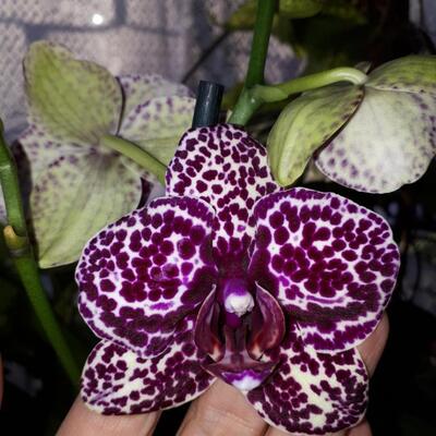 Может, ей нужна орхидея , так называемый, Дикий кот? Погуглите, может, у вас есть цветочные форуме в городе,иногда люди заказывают с Таиланда. Но часто они встречаются и в обычных цветочных, то есть голландские тоже такие тащат. Есть ещё Ванды, они тоже крапчатые, покажите жене, может,это то, что она ищет. На снимке фаленопсис Дикий кот. Ещё бывают камбрии пятнисто-полосатые.