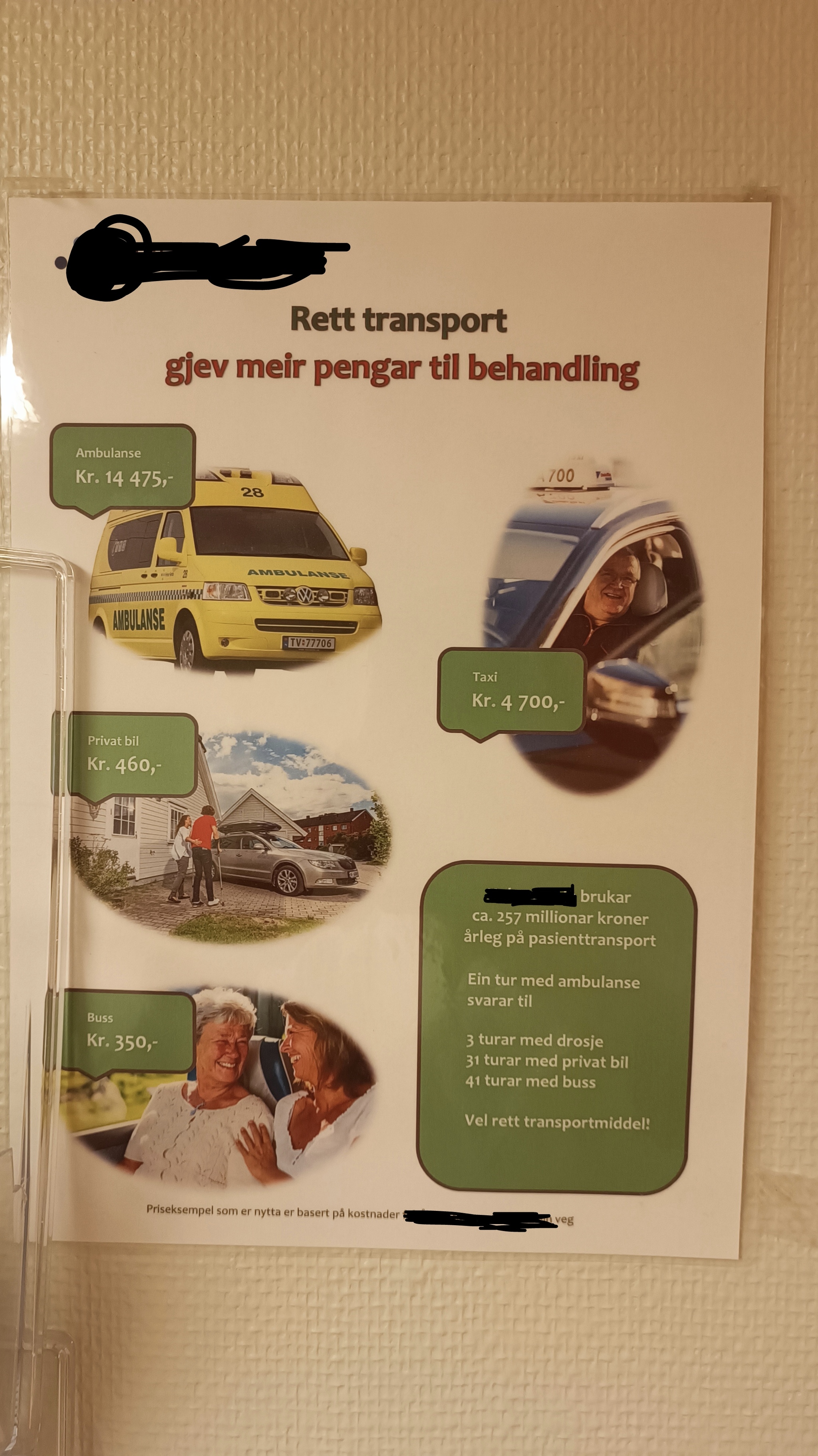 Большая больница по местным понятиям и небольшая если сравнивать с нашими. И вот за год она тратит 257 млн крон. Ну или 25 млн евро. Неплохо так. Если пациент живёт в "удобном" месте и его можно отправить на общественном автобусе(ну и состояние позволяет, естественно), то это прям успех.