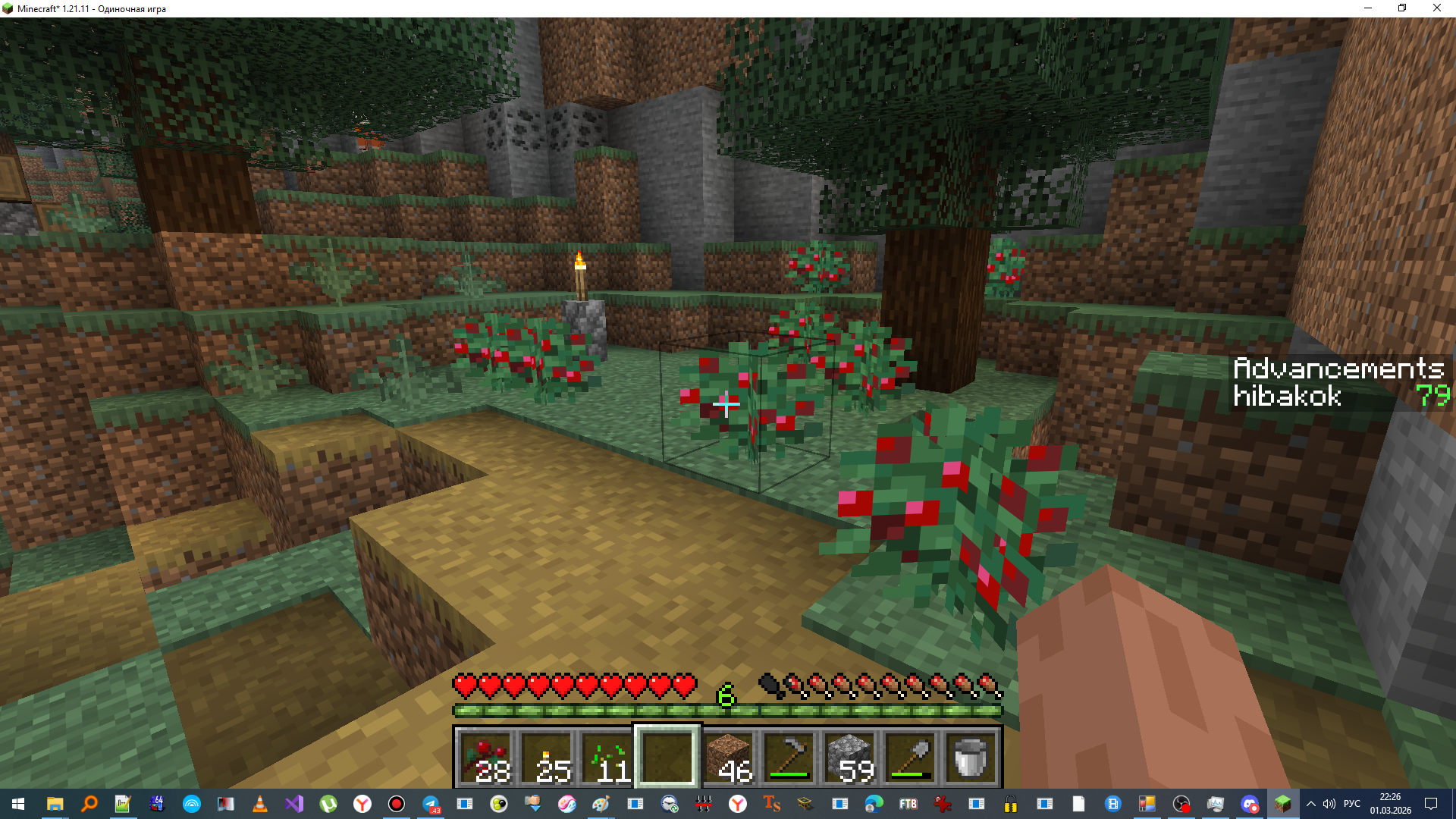 Сейчас у меня имеется избыток еды, так как я постоянно собираю урожай с ягодных кустов растущих около моей базы. Во время путешествия также были собраны множество ягод.