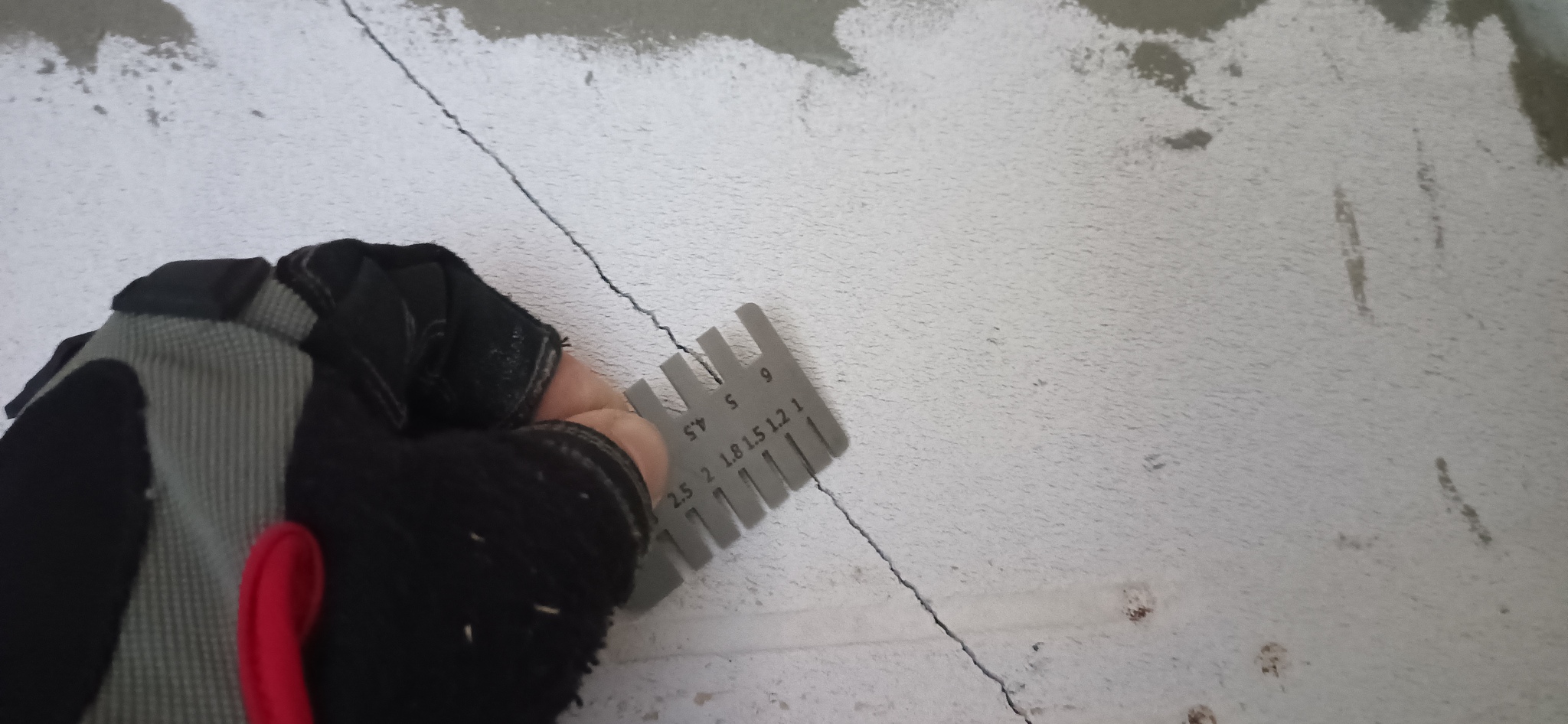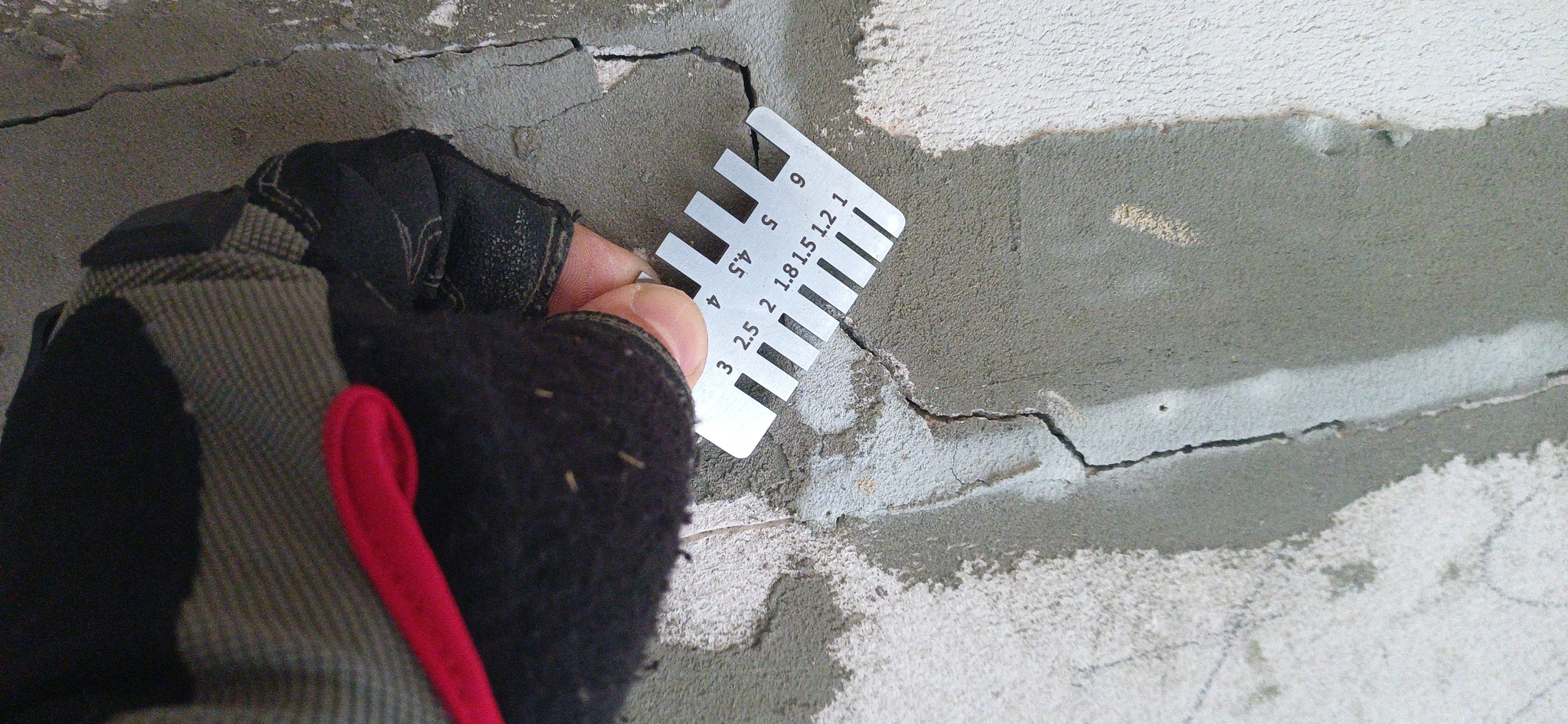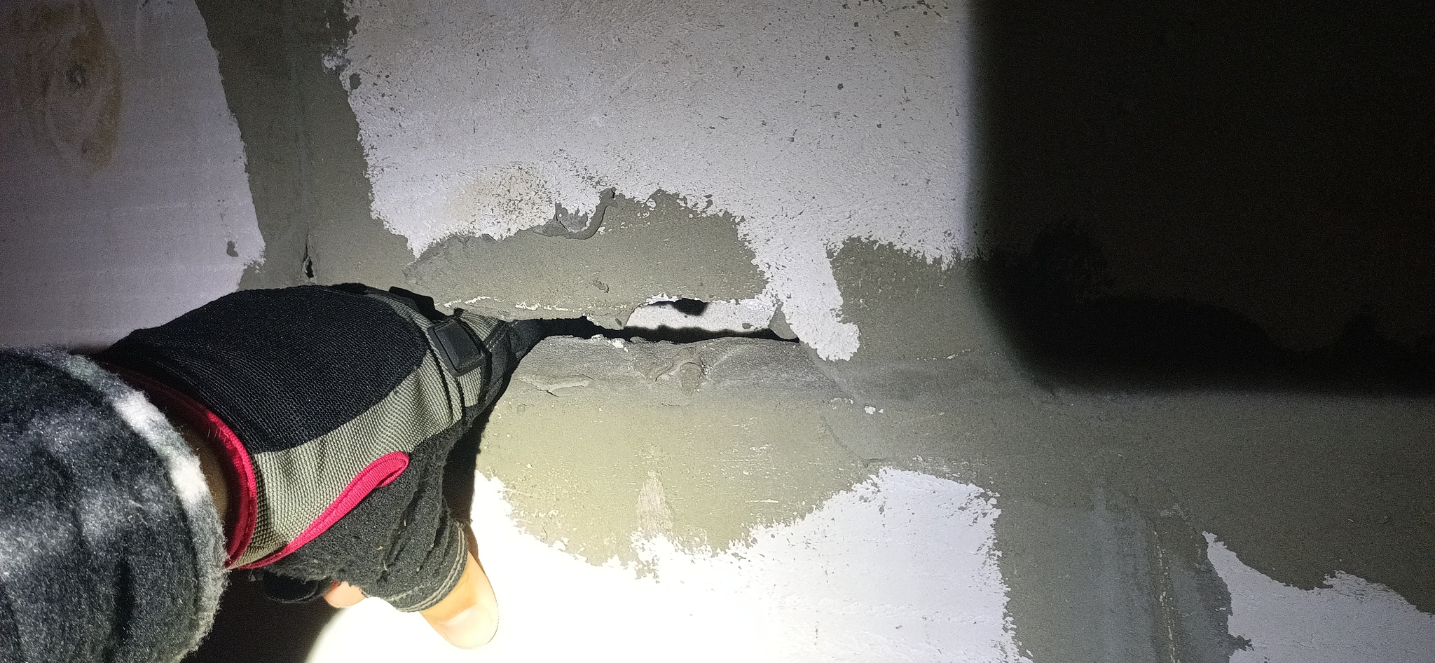 Проблемы не заставили себя ждать - нас встречает трещина шириной более полусантиметра, двигающаяся снизу вверх. Видно, что её пытались заштукатурить, но что-то пошло не так или она разъехалась.