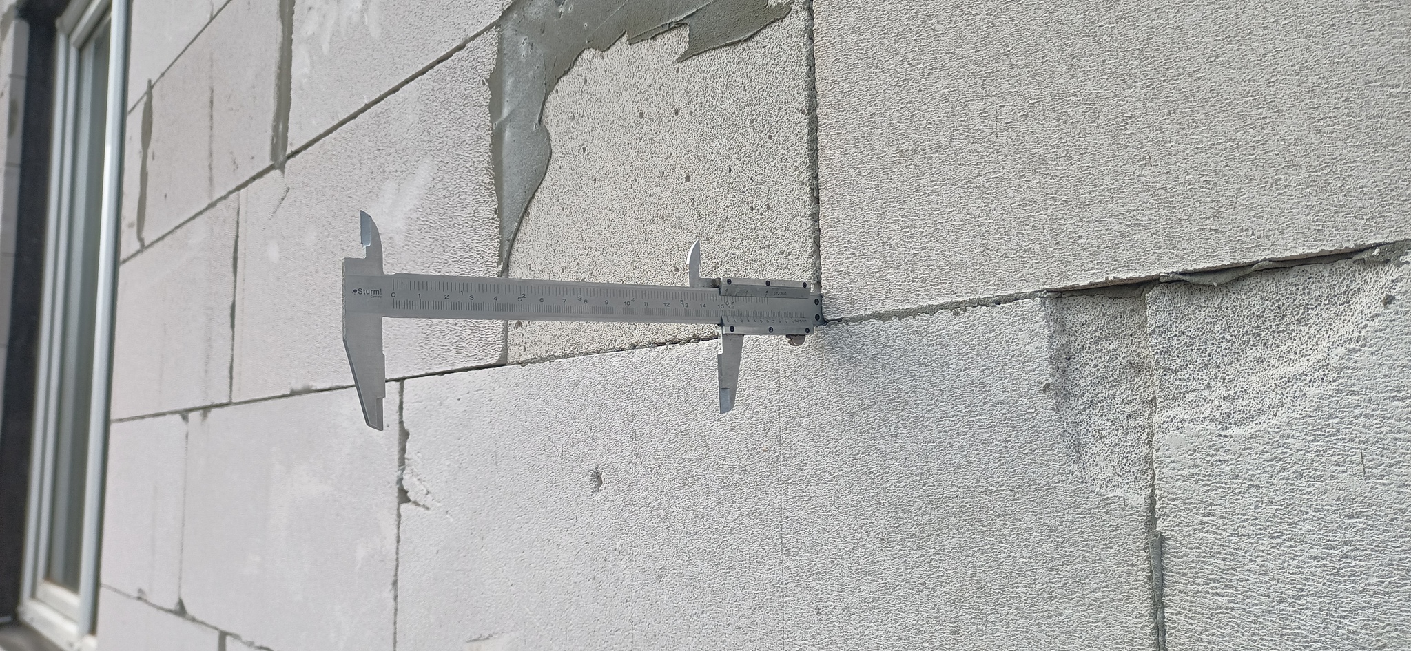 В стенах, видимо, замурованы клады, т.к. то здесь, то там, встречаются такие вот пустоты, заполненные раствором. Те, кто строил этот дом, не понимали, что плотность бетона и газоблока сильно различается и в процессе усадки такие закладные элементы из бетона действуют на блоки как домкрат.