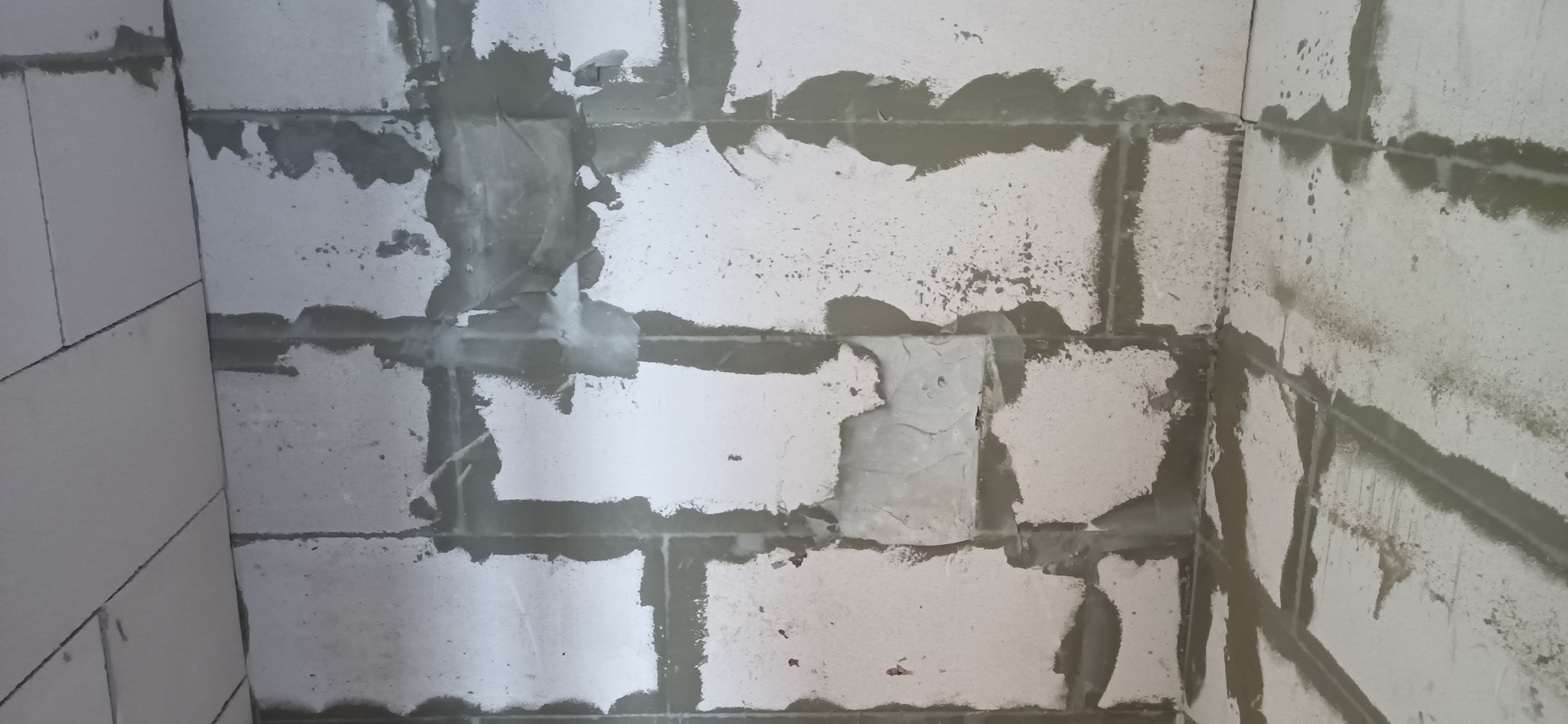 Казалось бы, ну потерпи, кладка, прости ошибки, газобетон! Но нет, из-за отсутствия раствора и его низкого качества в целом все стены покрыты сетью трещин разной толщины. Многие из них сквозные.