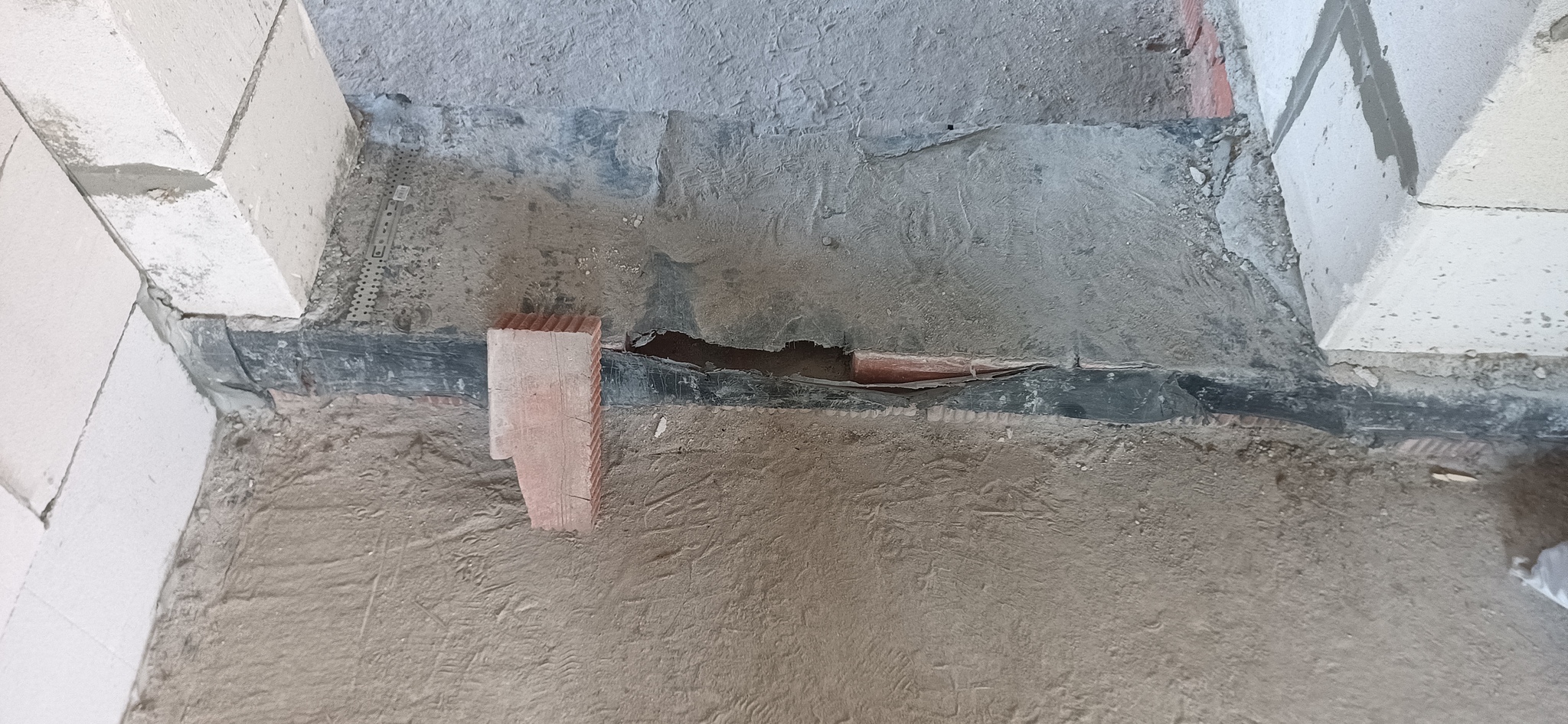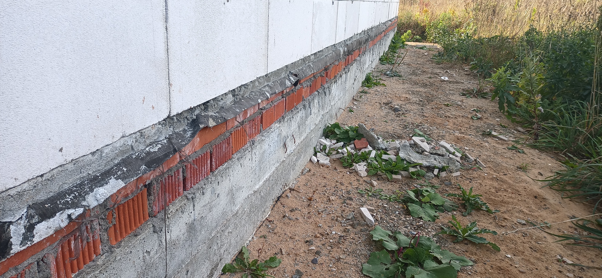 На объекте меня встретил один заказчик, хотя сказочники подрядчики обещали также приехать на дефектовку. Но что-то не срослось и они не явились. Ок. Дом одноэтажный, фундамент - плита, цоколь под первый ряд выложен из керамического полнотелого кирпича. Затем, основание под первый ряд выровняли экстремально толстым слоем раствора.