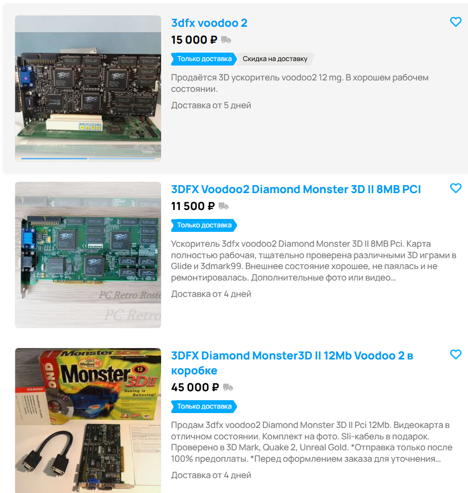 Второй момент - отрисовка графики в игре, здесь она поддерживалась ускорителем Voodoo через Glide. Соответственно, запустить графику напрямую, на какой-нибудь новенькой RTX у нас не получится. Что же в таком случае делать? Поставить в современный ПК старую видеокарту Voodoo? Теоретически, это сделать возможно, но вот на практике, такие древние артефакты как Voodoo и Voodoo 2, в исправном состоянии, пользуются большой ценностью у ретро-энтузиастов, поэтому цены на видеокарты 27-летней давности вас сильно удивят:
