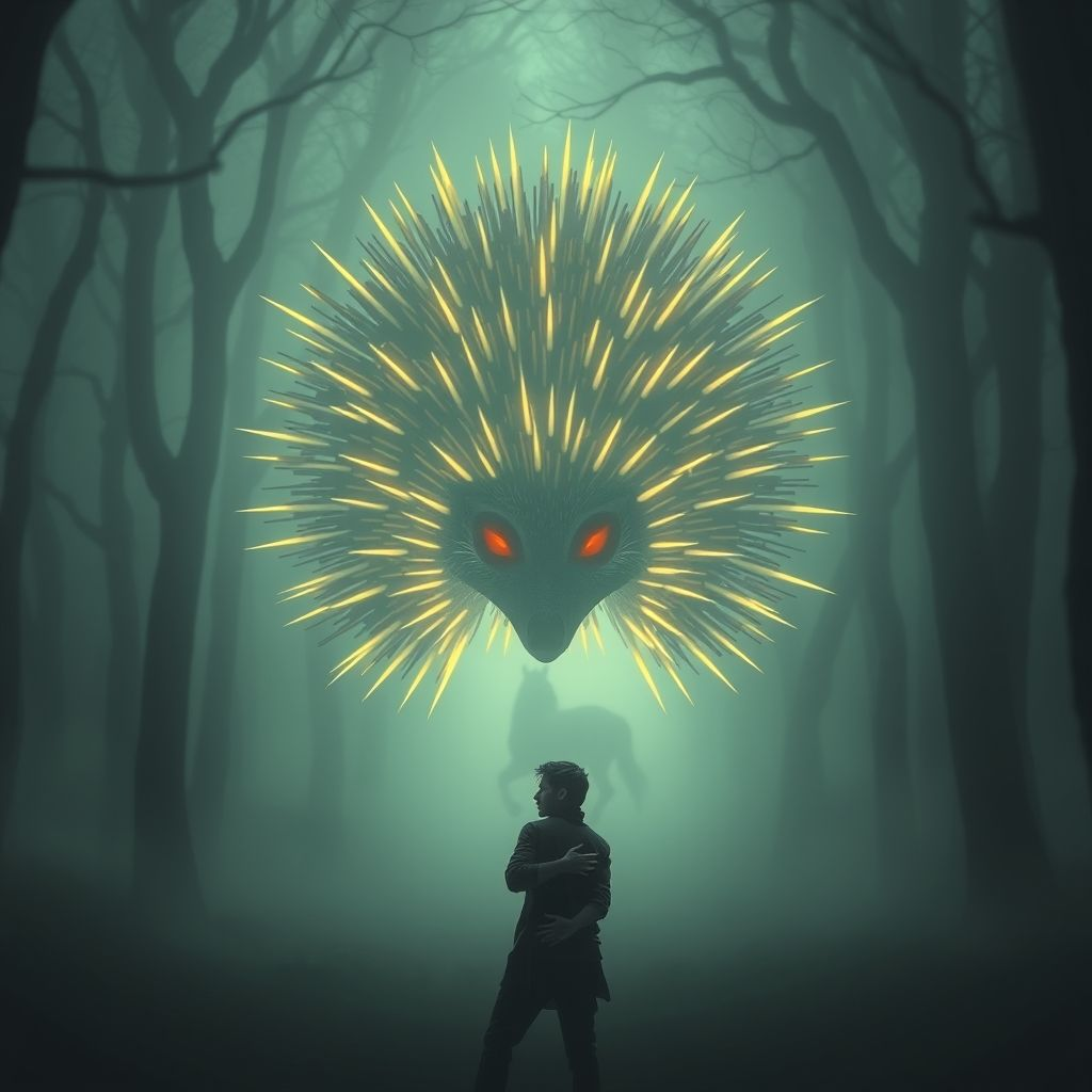 В одной маленькой деревне есть место, которое местные обходят стороной после заката. Это старый лес на окраине, где каждую ночь поднимается густой туман. Но этот туман необычный — сквозь него можно услышать странные звуки и увидеть силуэт огромного ежа, покрытого светящимися шипами.
