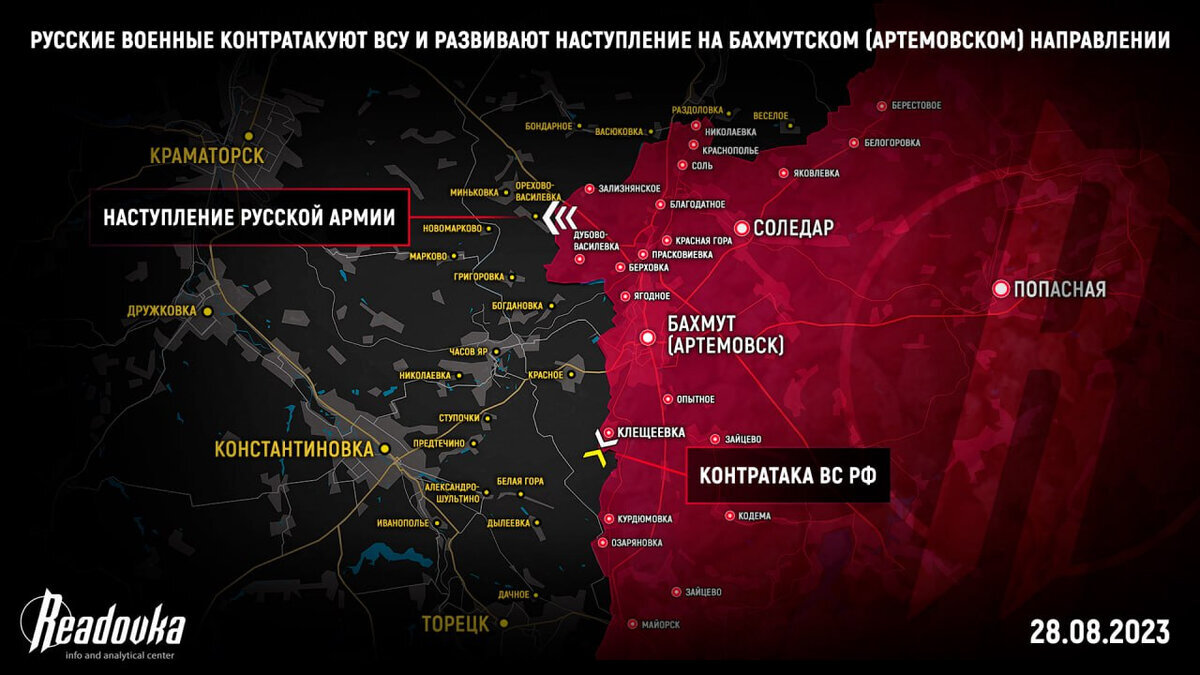 Артемовское направление: На Бахмутском (Артемовском) направлении не прекращаются бои у Клещеевки - российская армия вновь контратаковала позиции ВСУ. Хоть боевики и задействуют пехоту при поддержке бронетехники и артиллерии, им все равно не удается отразить наши удары. Также бойцы ВС РФ развивают наступление в районе Орехово-Васильевки ДНР.