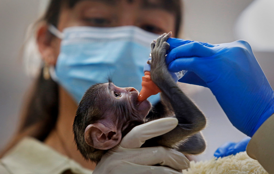 Кормление детеныша мартышки-гусара в зоопарке Гвадалахары, Мексика//Фото: Fernando Carranza Garcia/picture alliance via Getty Images