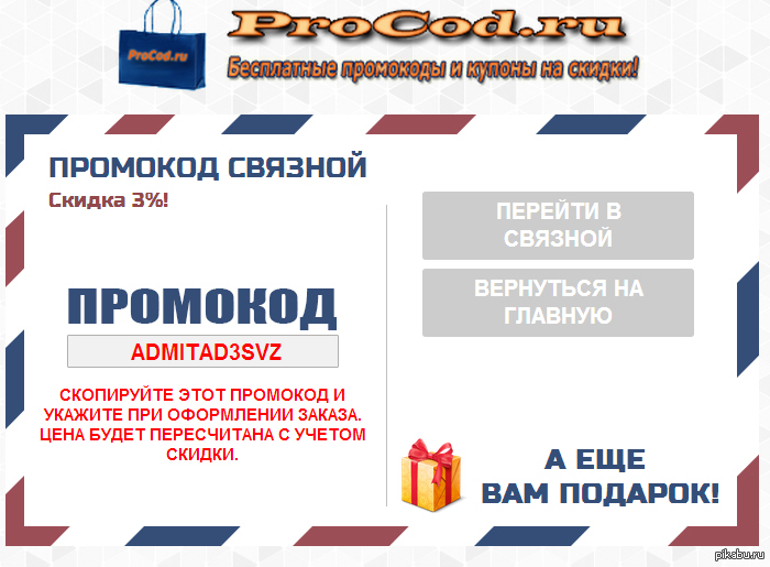 IdeaStatus Промокод на скидку в Интернет-магазине Связной. 10 лет назад Используйте промокод ADMITAD3SVZ в Интернет-магазине Связной и получите скидку 3%. [моё] Связной Промокод Скидки