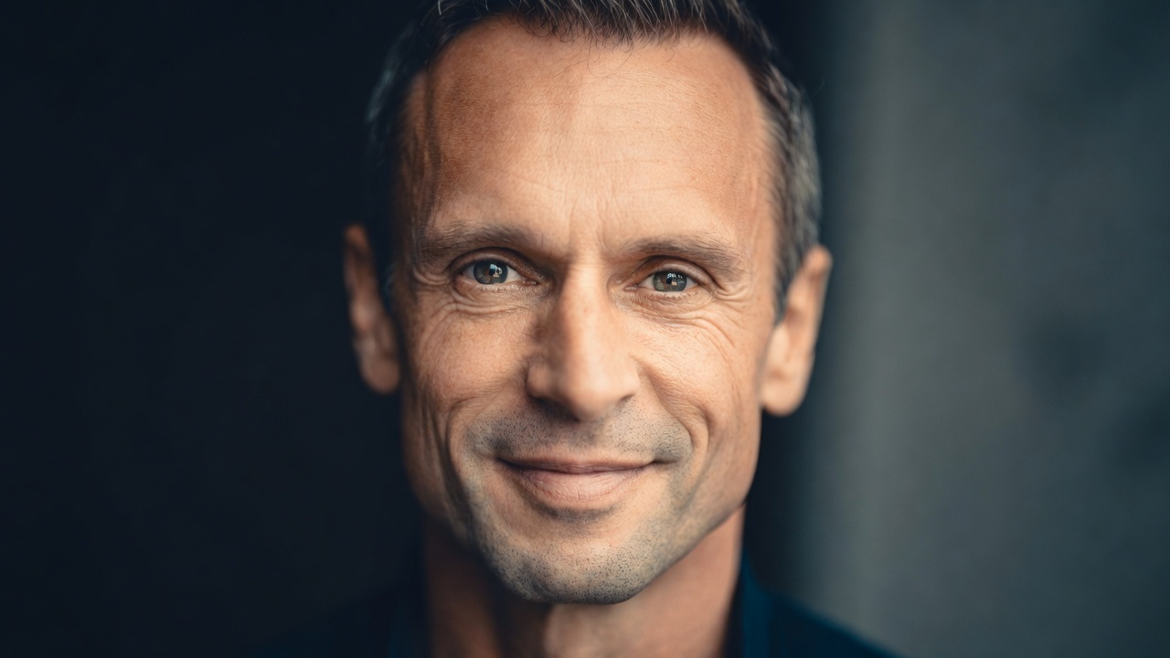 Классический студийный портрет. Мужчина в классическом портрете, смотрит прямо в камеру, уверенный взгляд, легкая улыбка. Фон — темная студия с мягким боковым освещением, создающим объем на лице. Объектив 85 мм, малая глубина резкости, разрешение 8K, высокая детализация текстуры кожи, цветовая гамма нейтральная.