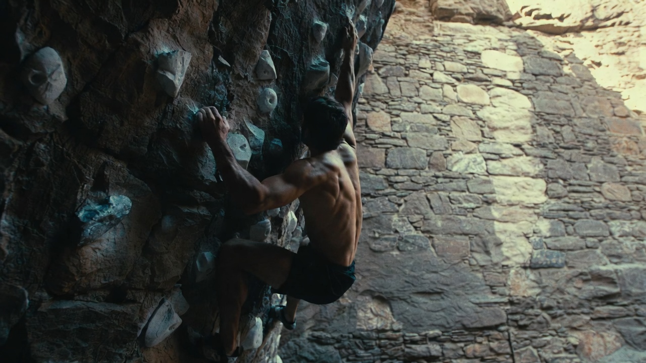 Скалолаз (Экстрим). Мужчина на скалодроме или реальной скале, тянется к следующей зацепке, видны напряженные мышцы. Фон — фактурная каменная стена, освещение естественное, жесткое. Объектив 24 мм, ракурс снизу, разрешение 6K.