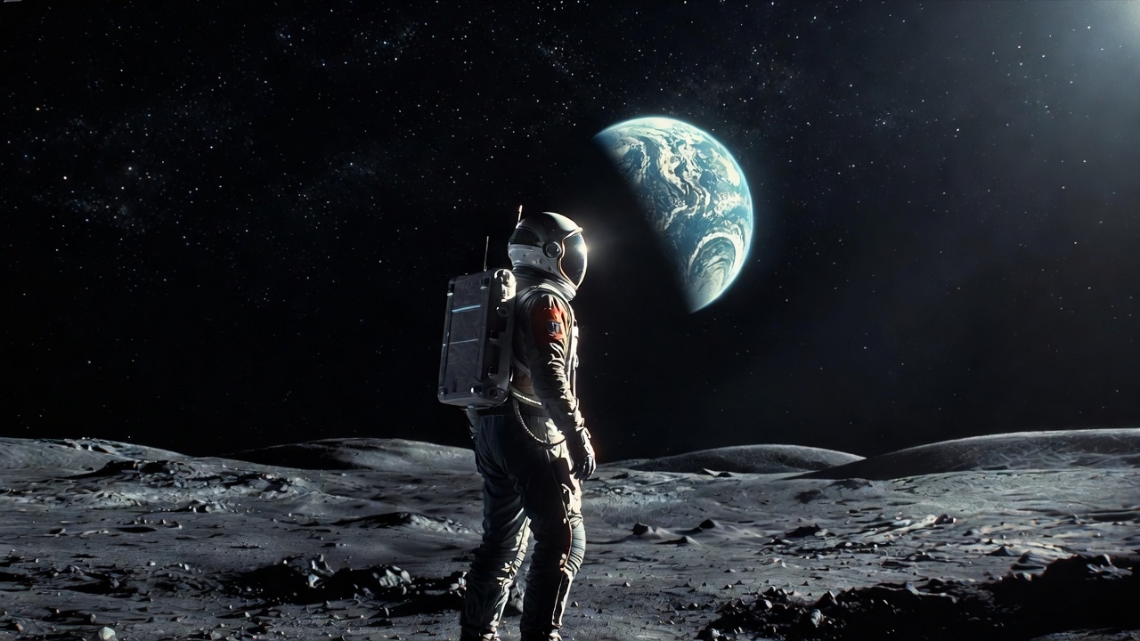 Космический исследователь. Мужчина в футуристичном скафандре, стоит на поверхности Луны, смотрит на Землю в небе. Фон — черное звездное пространство, освещение лунное жесткое. Стиль sci-fi, объектив 24 мм, эпический масштаб, разрешение 8K.