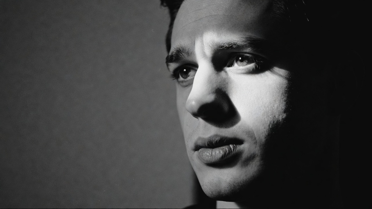 Черно-белая задумчивость. Мужчина в черно-белом портрете, задумчивое выражение лица, голова слегка наклонена. Фон — мягкий градиент от серого к черному, освещение рембрандтовское (треугольник света на щеке). Объектив 50 мм, легкая зернистость пленки, разрешение 4K, акцент на выразительности глаз.