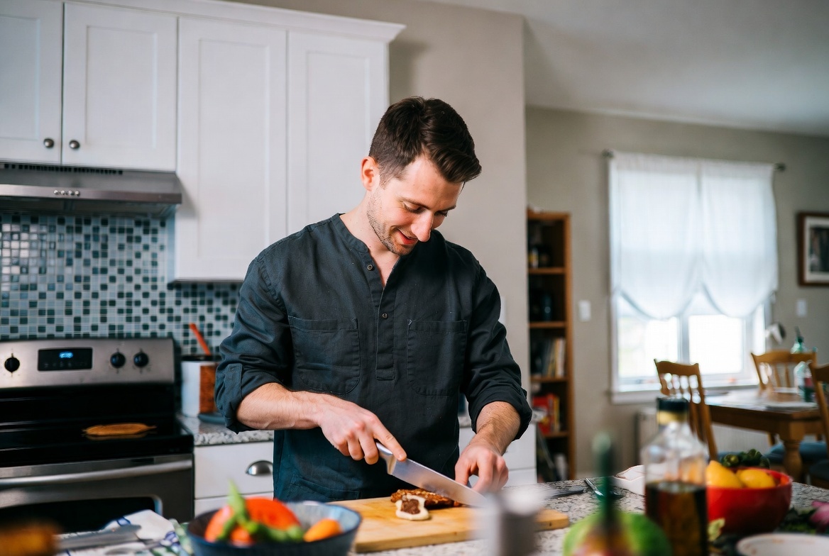 Домашний шеф-повар. Мужчина готовит на современной кухне, мастерски режет овощи, на лице добрая улыбка. Фон — интерьер кухни, освещение теплое домашнее. Стиль повседневный, объектив 50 мм, близкий план рук и лица, разрешение 8K.