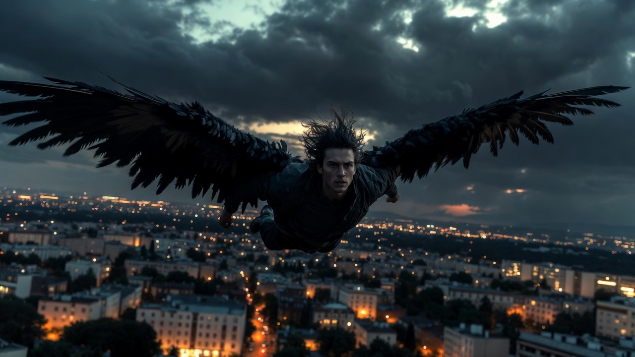 Крылатый герой. Мужчина с огромными черными крыльями, парит над спящим городом. Ветер в волосах, фон — ночные облака, освещение мягкое, лунное. Стиль темное фэнтези, объектив 35 мм, динамика полета, разрешение 6K.