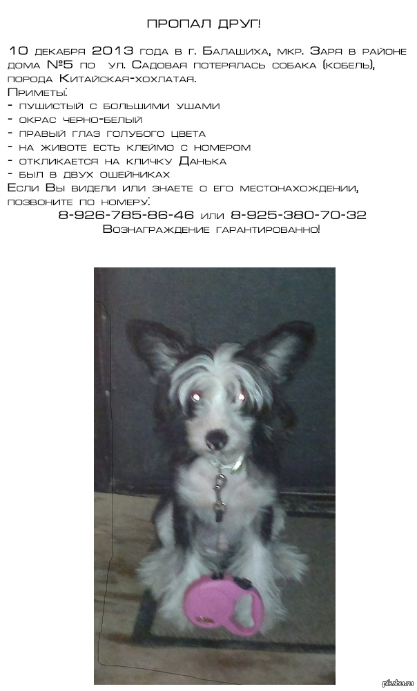 7 TheSimonSays 11 лет назад Пропал друг! Пикабу, помогите найти! Пропала собака, друг семьи, любимец детей. Хозяева очень переживают и не бросают поиски уже не сколько дней. Пропала собака Помощь Вознаграждение