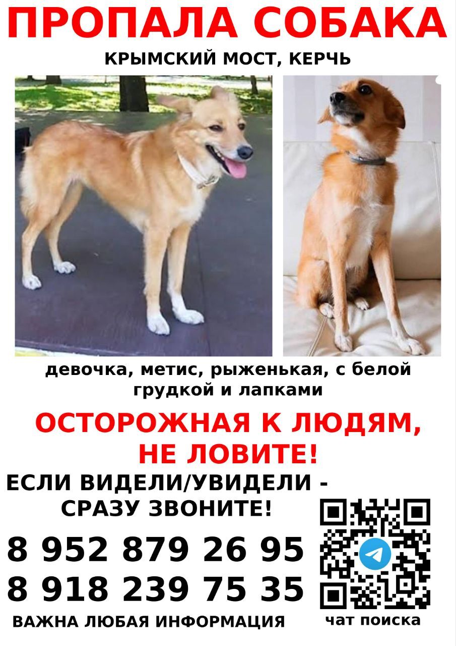 📍 Пропала на участке дороги между Крымским мостом и последней заправкой «Атан». Возможно, ее уже подобрали и забрали,у нее внутри ошейника есть номер хозяина, ошейник белый и второй ошейник тонкий зелёный от блох.