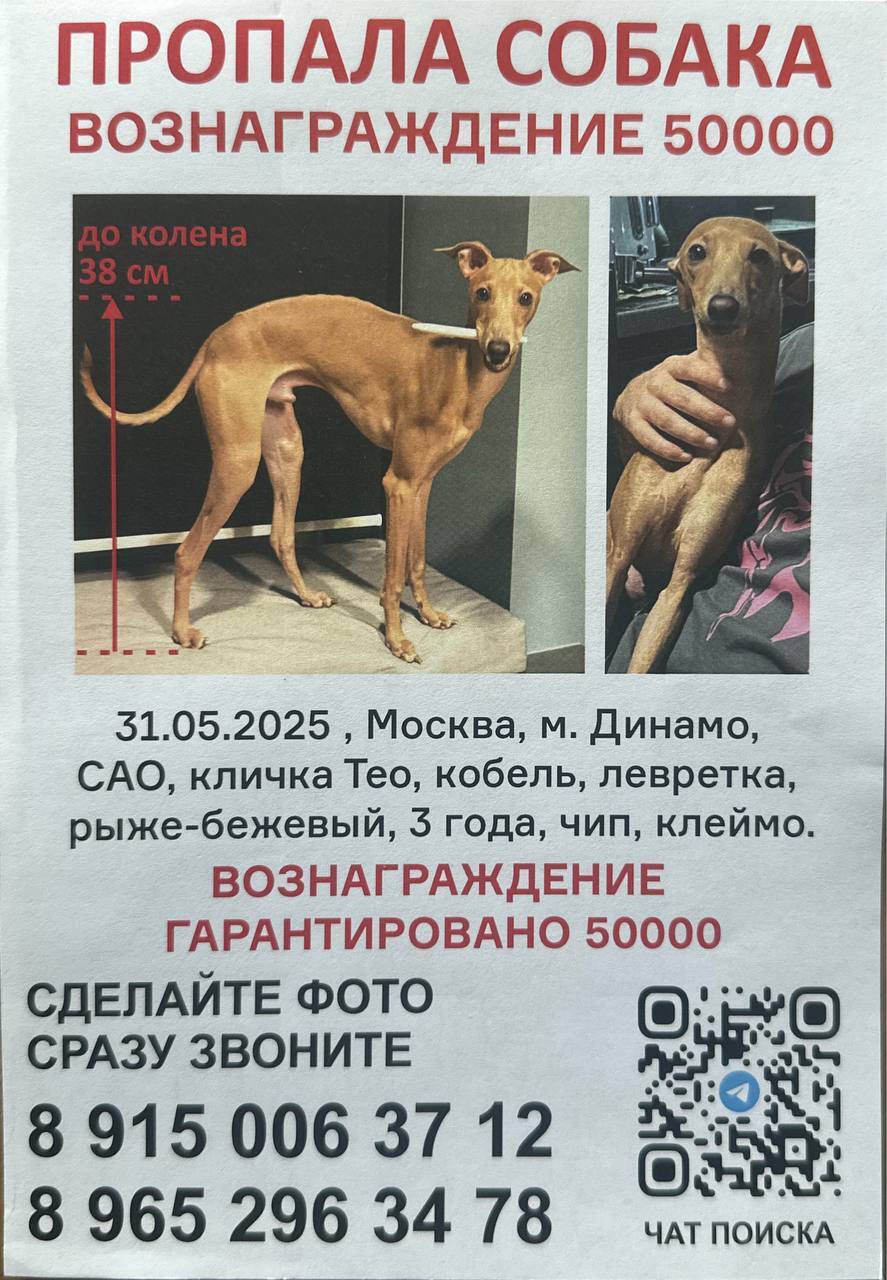 Порода левретка, рыже-бежевого окраса, мальчик 3 года, есть клеймо, чип, в момент пропажи был в ошейнике. Кличка Матео.