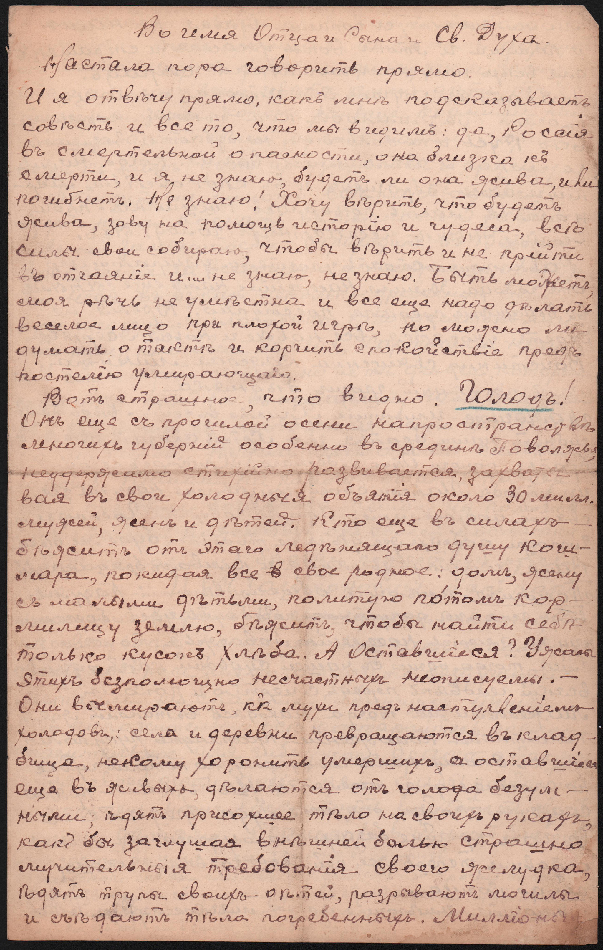 Вот страшное, что видно. Голод! Он еще с прошлой осени на пространстве многих губерний, особенно в середине Поволжья, неудержимо стихийно развивается, захватывая в свои холодные объятия около 30 милл. мужей, жен и детей. Кто еще в силах – бежит от этого леденящего душу кошмара, покидая все свое родное: дом, жену с малыми детьми, политую пóтом кормилицу землю; бежит, чтобы найти себе только кусок хлеба. А оставшиеся? Ужасы этих беспомощно несчастных неописуемы. Они вымирают, как мухи пред наступлением холодов; села и деревни превращаются в кладбища, некому хоронить умерших, а оставшиеся еще в живых делаются от голода безумными; едят присохшее тело на своих руках, как бы заглушая внешней болью страшно мучительные требования своего желудка, едят трубы своих детей, разрывают могилы и съедают тела погребенных. Миллионы людей гибнут, с воплем взывая к нам о помощи и этот вопль ужасен и страшен для всех нас как могильный смрад.