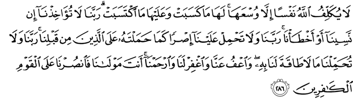 Аллах не возлагает на человека сверх его возможностей. Ему достанется то, что он приобрел, и против него будет то, что он приобрел. Господь наш!