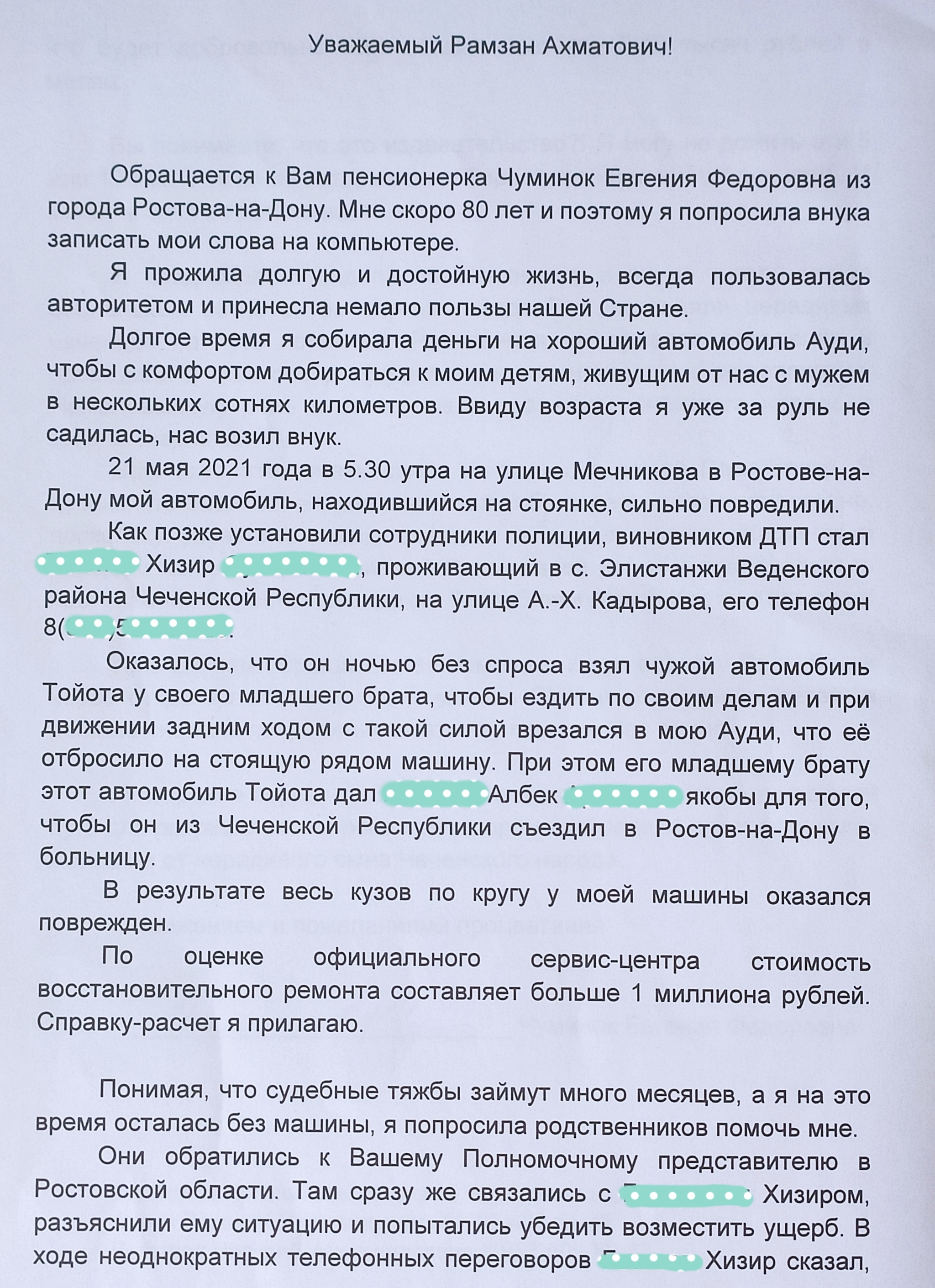 Видя эту ситуацию, с нашей помощью бабушка обратилась сначала к Вашему уполномоченному представителю в Ростовской области, а потом к Вашему помощнику - депутату Госдумы РФ Делимханову А.С. Конечно же и к Вам лично. Вот это письмо: