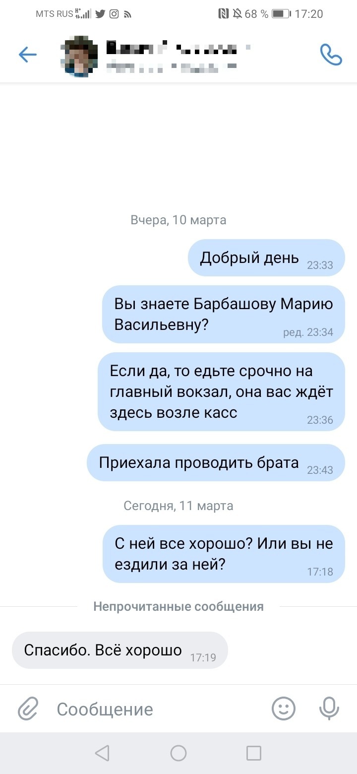 Товарищи, проживающие рядом с вокзалом, вы прямо сейчас можете сделать добро. На вокзале НСК-Главный возле касс сидит одна пожилая женщина. Она в куртке и шерстяном платке, зовут Барбашова Мария Васильевна. Она приехала проводить усопшего брата. Но проблема в том, что у неё нет телефона, и никто из её родственников не знает, что она здесь. Я нашёл предположительно её внука и написал, но я не знаю, когда он прочтёт и приедет за ней. Сейчас я в поезде и помочь ей более ничем не могу. Потому прошу вас, товарищи, прийти и оказать моральную поддержку, возможно даже накормить или, если сможете, достучаться до её родни. Она очень хороший человек. Надеюсь на вас, аноны. Если что-то сделаете, отпишитесь пожалуйста в комменты, как она там