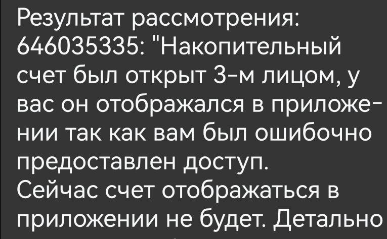 В итоге. По итогу жалоб чужой счёт удалили из банковского приложения, исчезла история о операциях с этим счётом и суммах на нём. Это нормально, просто удалить?) Как будто денег и не было. После долгого пинания прислали выписку с этого счёта.