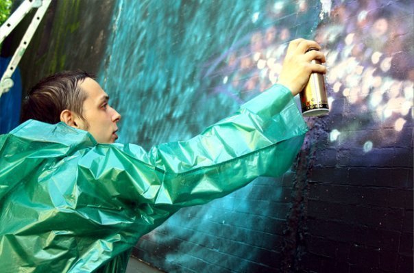 Стас у нас был с опытом, в том плане, что он уже рисовал баллончиками, и поэтому взялся рисовать ими звездную пыль, звёздочки, облака и планеты.