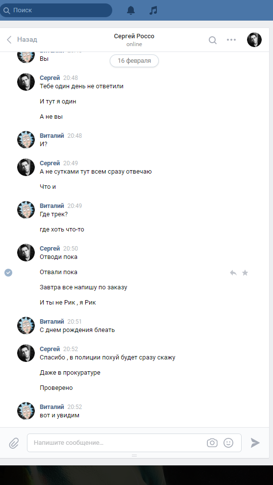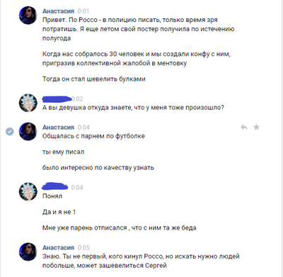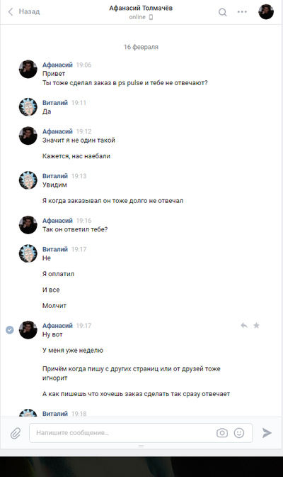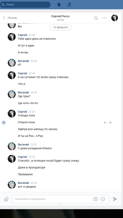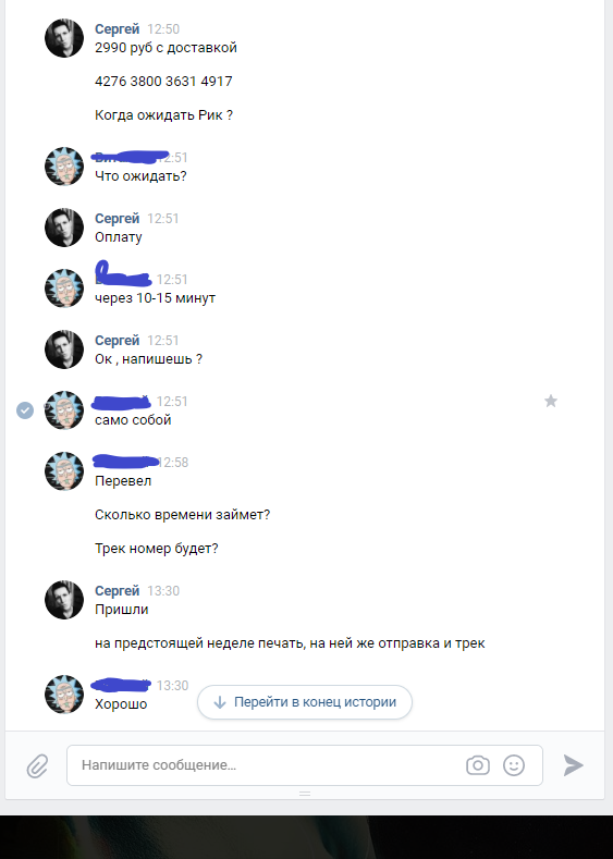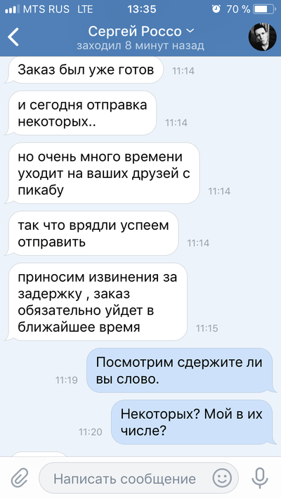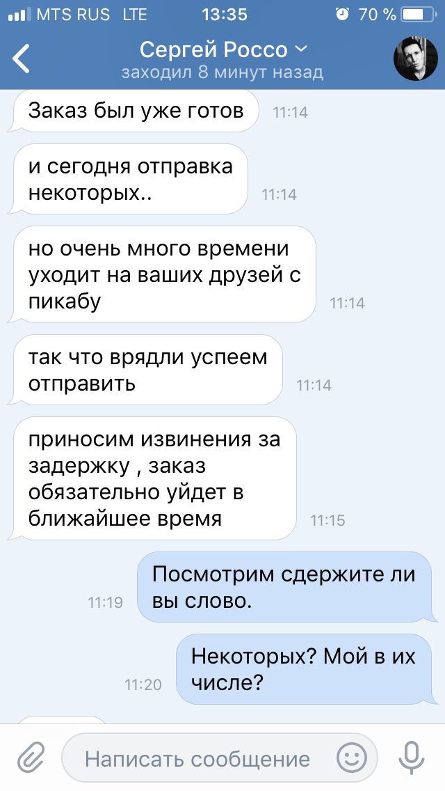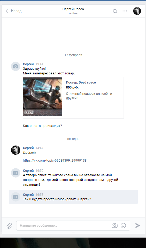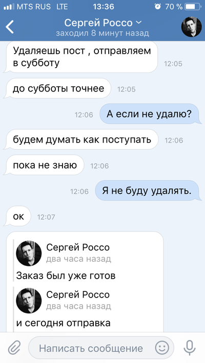 Обошлось мне все в 2990р. Группа довольна многочисленна и отзывов о покупках много так что сомневаться в этой группе повода не было. Я так же списался с парой человек , которые делали там заказы и они подтвердили, что им все пришло. После оплата заказа продавец написал, что заказ будет готов в течении недели и так же в течении недели он мне вышлет трек. Но этого не произошло. Я задал вопрос в группе о том когда будет готов мой товар. Отзыв стерли, а меня заблокировали. Продавец ответил на мое сообщение только раз после того как я написал, что обращусь в полицию и вот его ответ: