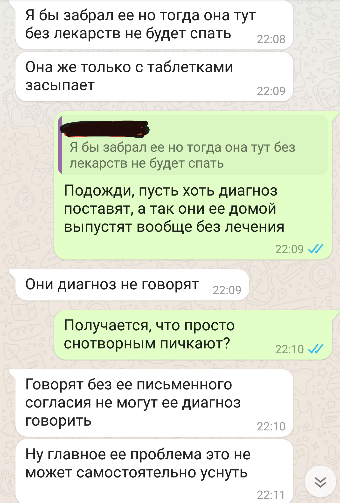 Прошу Вашего совета. У моего хорошего друга из Якутии есть жена, молодая, возраст не могу точно сказать. Трое маленьких детей, самому младшему 7 месяцев. У друга работа связана с довольно длительными командировками. Жена дома в декретном отпуске сама с детьми. Недавно он вернулся из командировки и обнаружил, что жена 2 дня (по словам тещи) в бредовом состоянии, заговаривается, путает прошлое с настоящим, спать совсем не может. Ее срочно увезли в психоневрологический диспансер на госпитализацию, где она спит под таблетками, без них не может уснуть. Весь вопрос в том, что он вот уже вторые сутки не может добиться от врачей диагноза. Они говорят, что диагноз могут ему огласить только с ее письменного согласия. Но когда он просит, чтобы врачи получили это согласие, то они говорят, что она не в состоянии его дать... В то же время согласие на вакцинацию от ковида она "якобы" может дать.. Какой-то сюр, если честно(((