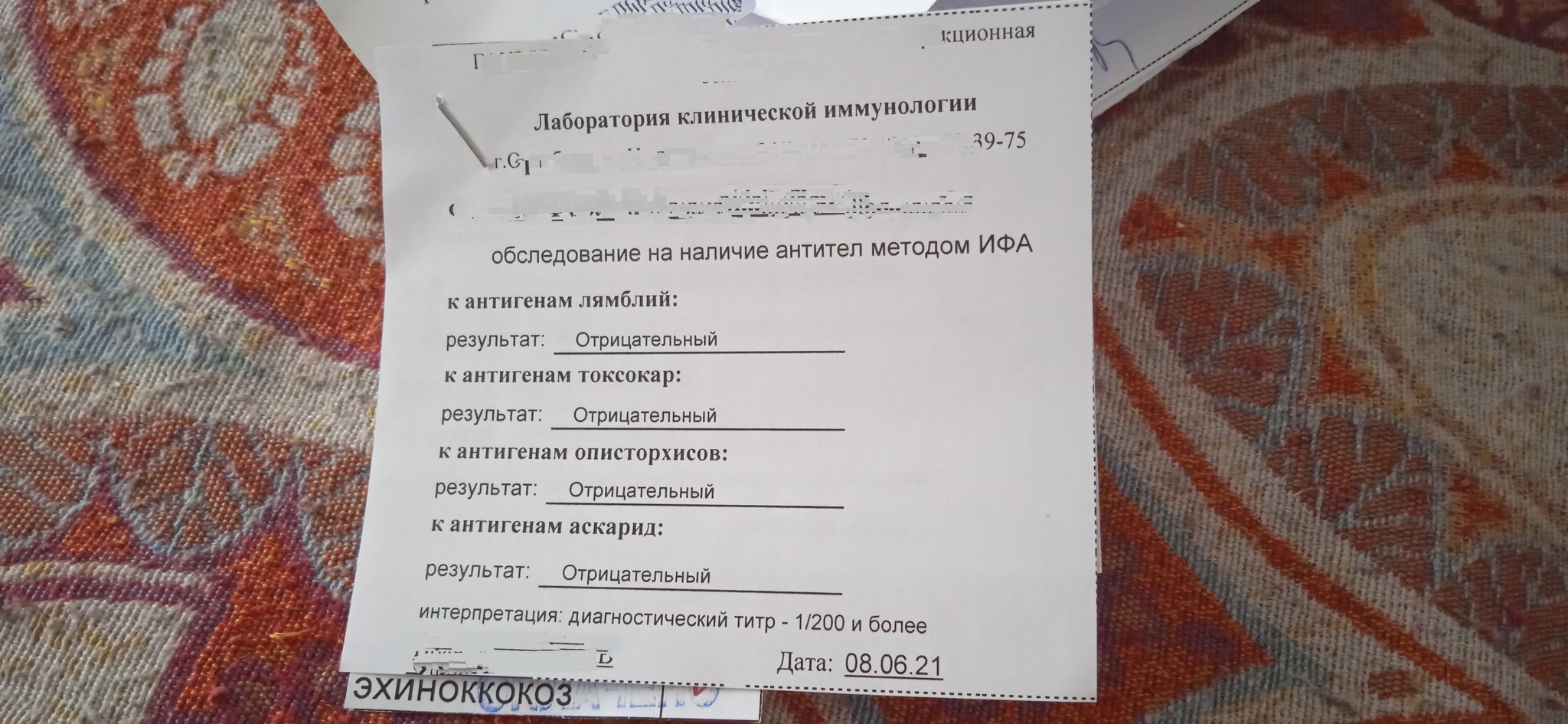 После этого она сдала анализы на Гепатиты и паразитов, всё отрицательно: