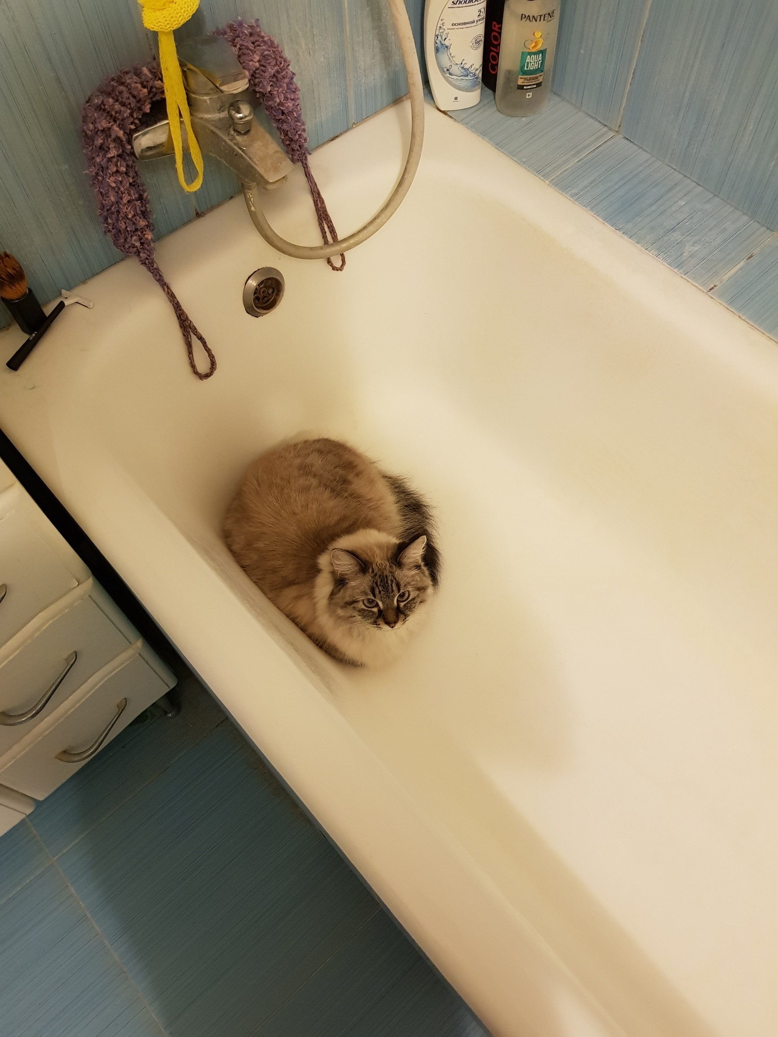 Всегда это делает на ночь глядя. Не успею её высушить. Фена боится. Да, и это после того, как я принимаю душ. Ей тоже надо. Воду очень любит. В Волге плавает, как собака, мыть только потом от тины дольше.