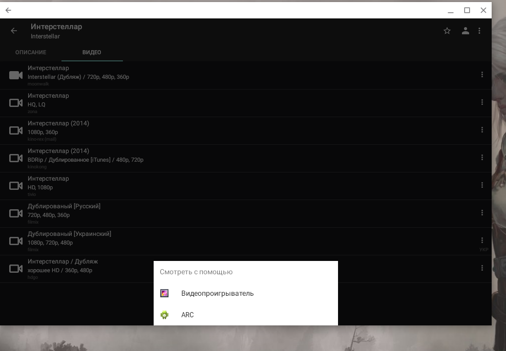 Находим нам нужны фильм, выбираем понравившееся качество и ресурс от куда будет происходить трансляция, дальше нас спросят что не установлен MXPlayer жмём продолжить и выбираем ARC