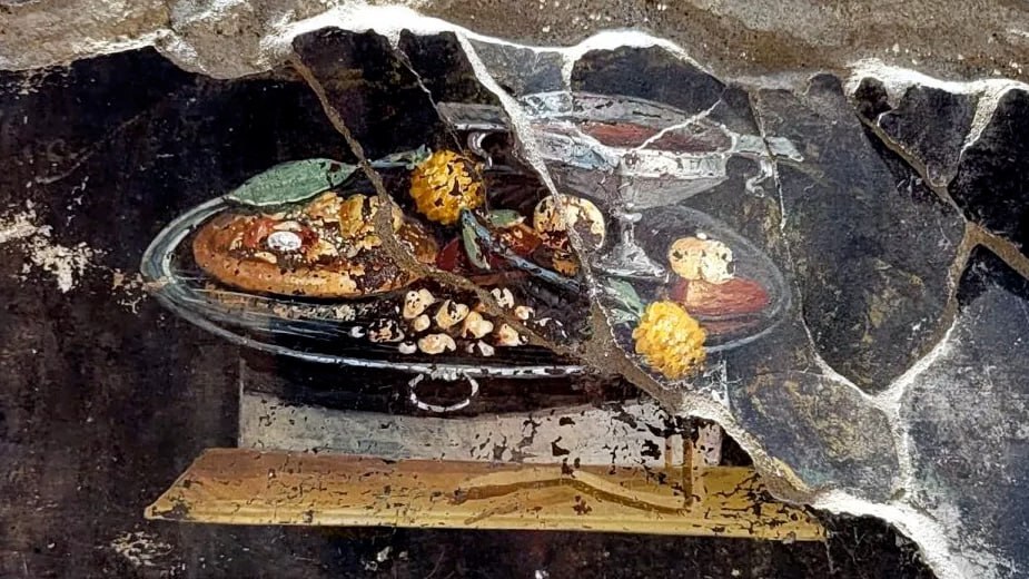 В Помпеях, засыпанных в начале новой эры пеплом Везувия, - очередная интересная находка. На тот раз археологи наткнулись на фреску-натюрморт. На серебряном подносе - видимо, типичные блюда и напитки, точнее, напиток, которым отдавали должное небогатые жители древнеримского города. Финики, гранаты, ягоды, бокал, наполненный вином и... пицца.