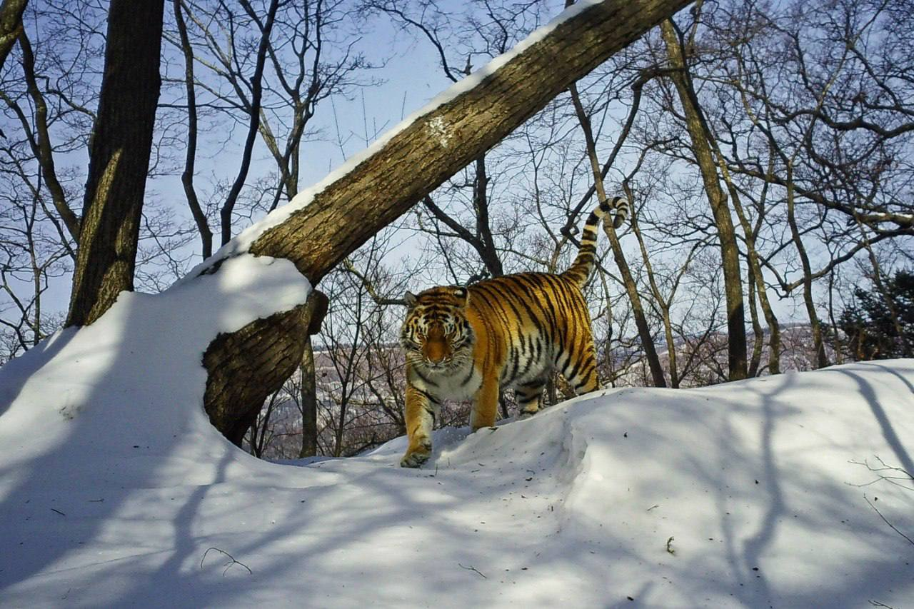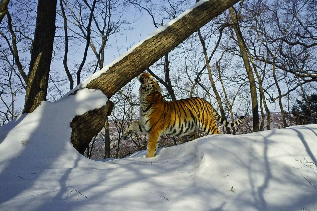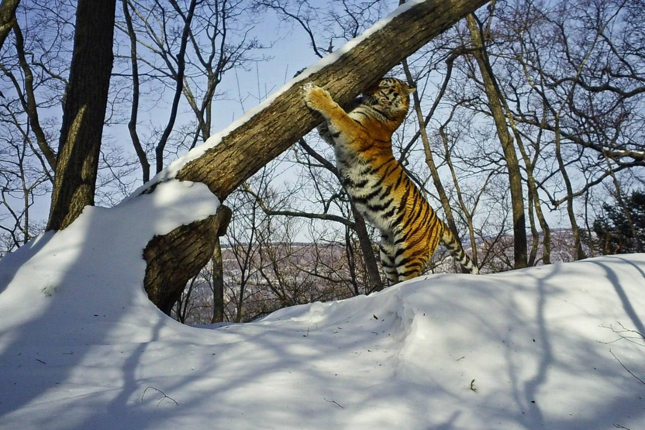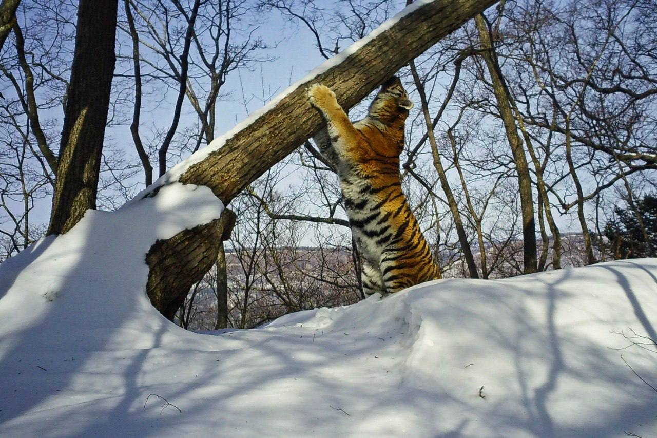 Это дерево выделяется на фоне других за счёт того, что его ствол направлен в сторону. Именно такие деревья привлекают внимание амурских тигров для маркировочных меток - как визуальных, так и запаховых. На фото тигр оставляет на стволе дерева свой запах.