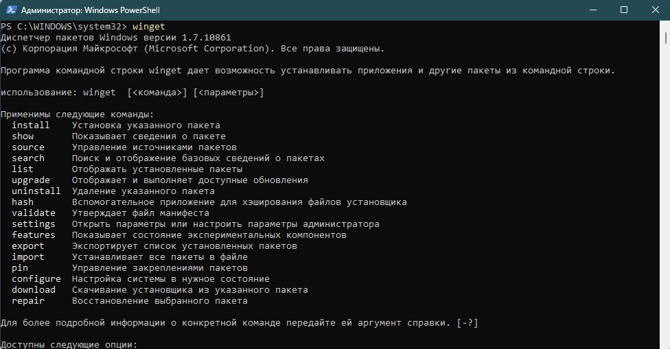 Менеджер пакетов winget уже предустановлен в последних версиях Windows 11 и Windows 10. Проверить, установлен ли он у вас можно, запустив Терминал Windows или Windows Powershell от имени администратора (сделать это можно через меню по правому клику на кнопке «Пуск») и введя команду winget. Если в результате вы видите список доступных команд winget для установки приложений, значит он установлен на компьютере.