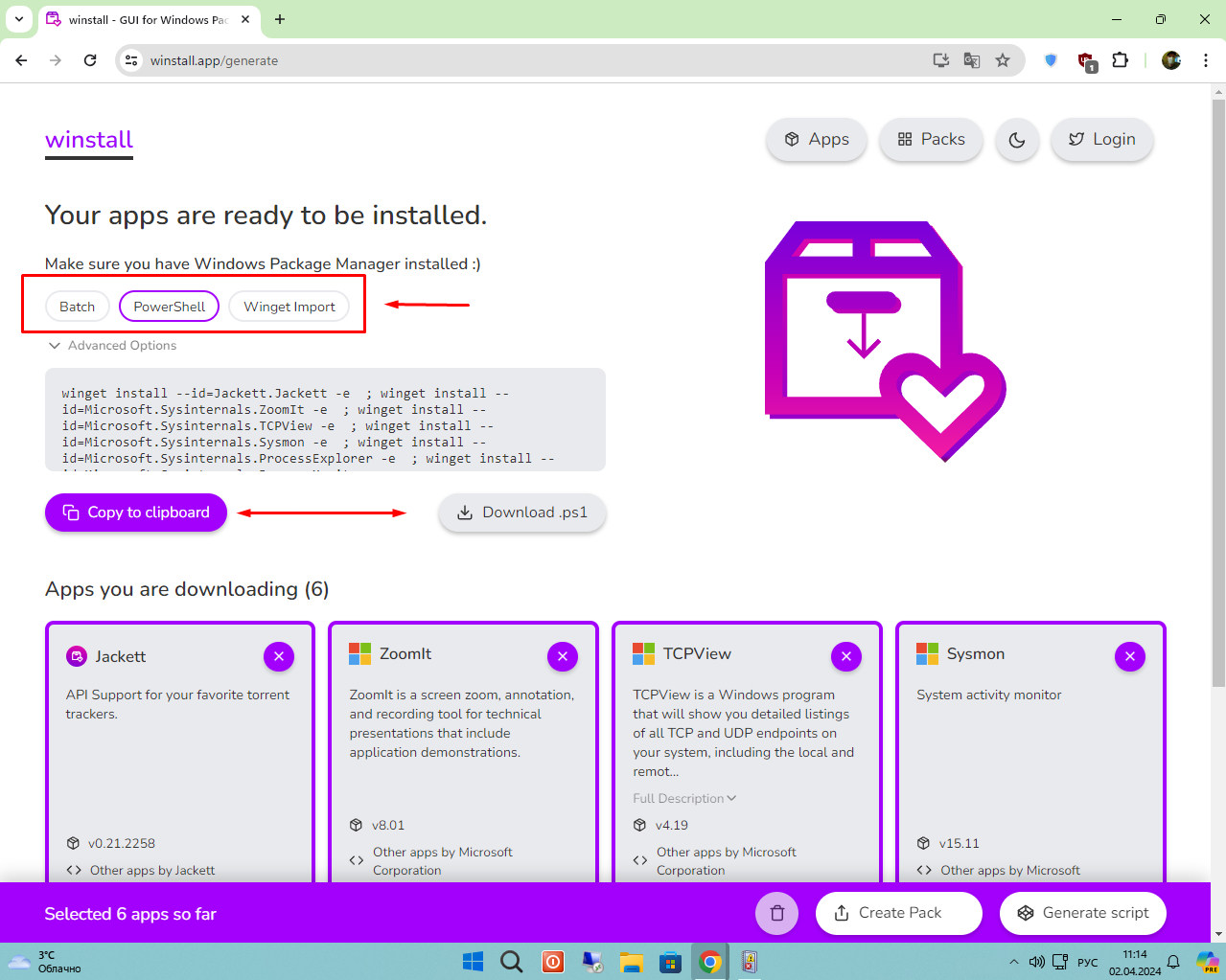 Можно значительно облегчить эту утомительную процедуру, если требуется установить много софта. Для этого есть отличный интернет ресурс: https://winstall.app/ - это по сути графический режим для пакетного менеджера Windows Winget. Ресурс имеет огромную базу пакетов, которая присутствует в winget и позволяет вам выбрать их нужное количество, после чего сформировать простой скрипт на PowerShell. Выбираем приложения для установки, или сразу готовые пакеты программ: